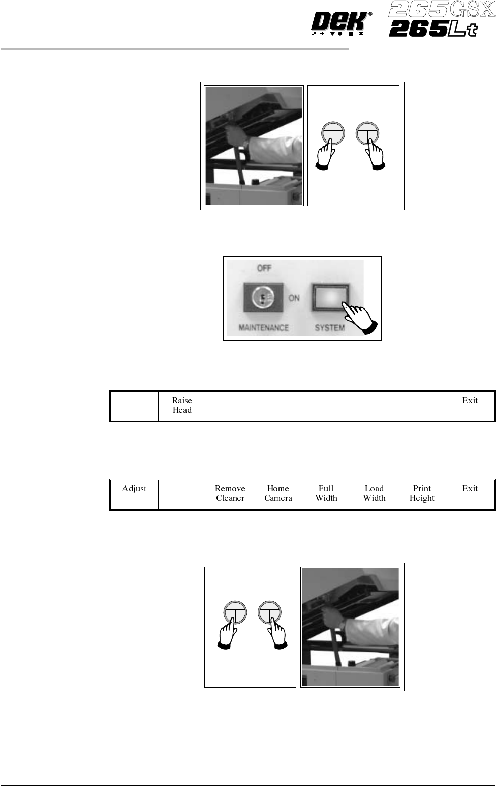 19. Press the System button. 20. Select Home Camera (F4). Home Camera 21. Select Print Height (F7). Print Height 22. Select Raise Head (F2). Raise Head 23. Raise the printhead using two button control. Fit the head prop.…