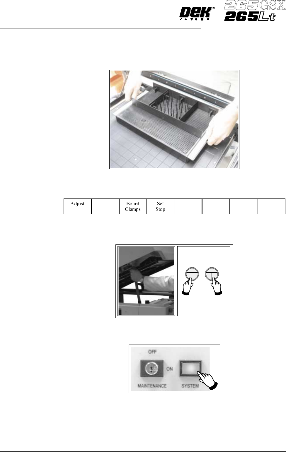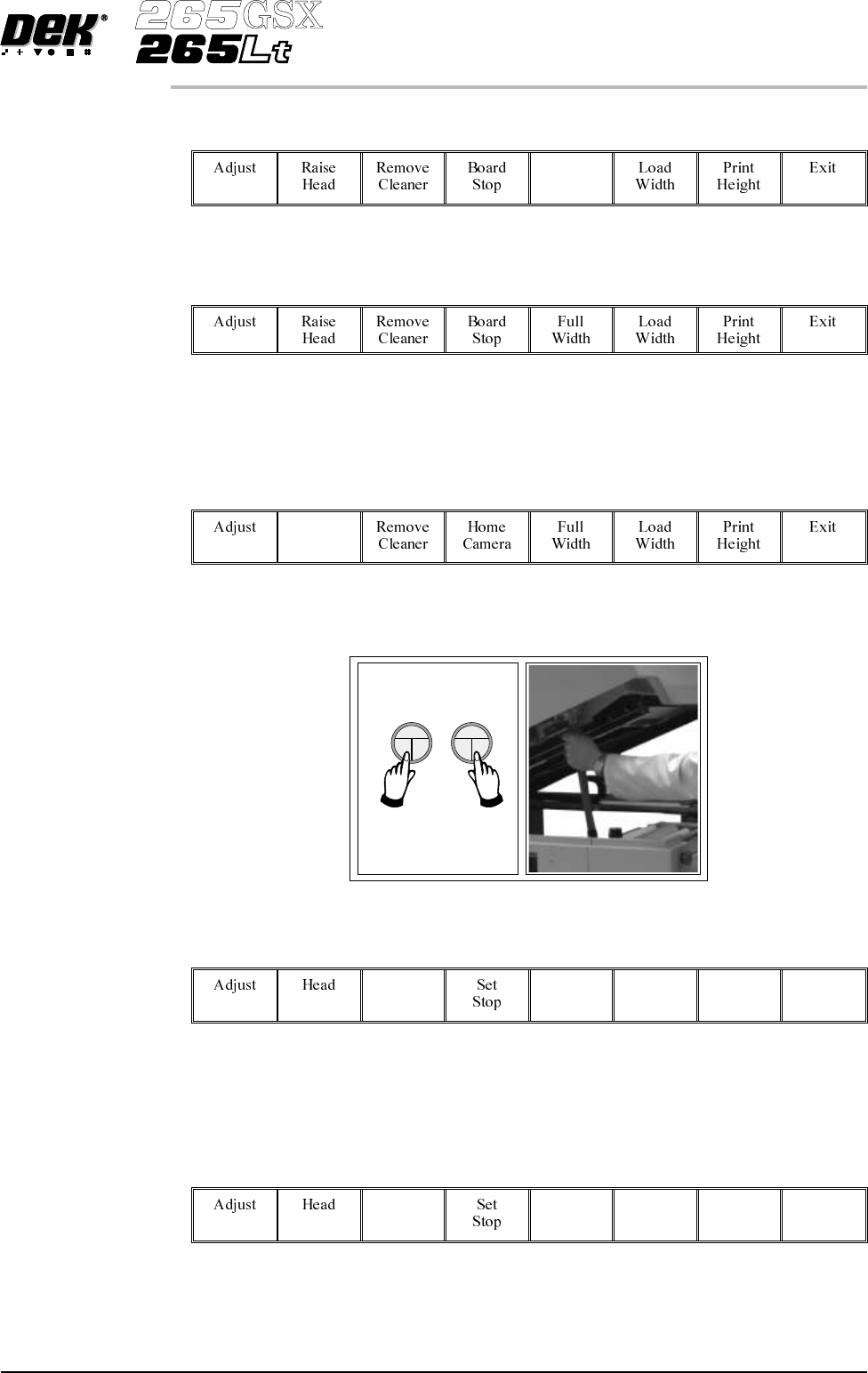14. Select Board Width (F5). Board Width 15. Select Board Stop (F4). The camera moves to the board stop position. The board stop on the camera extends. 16. Select Raise Head (F2). Raise Head 17. Raise the printhead using…