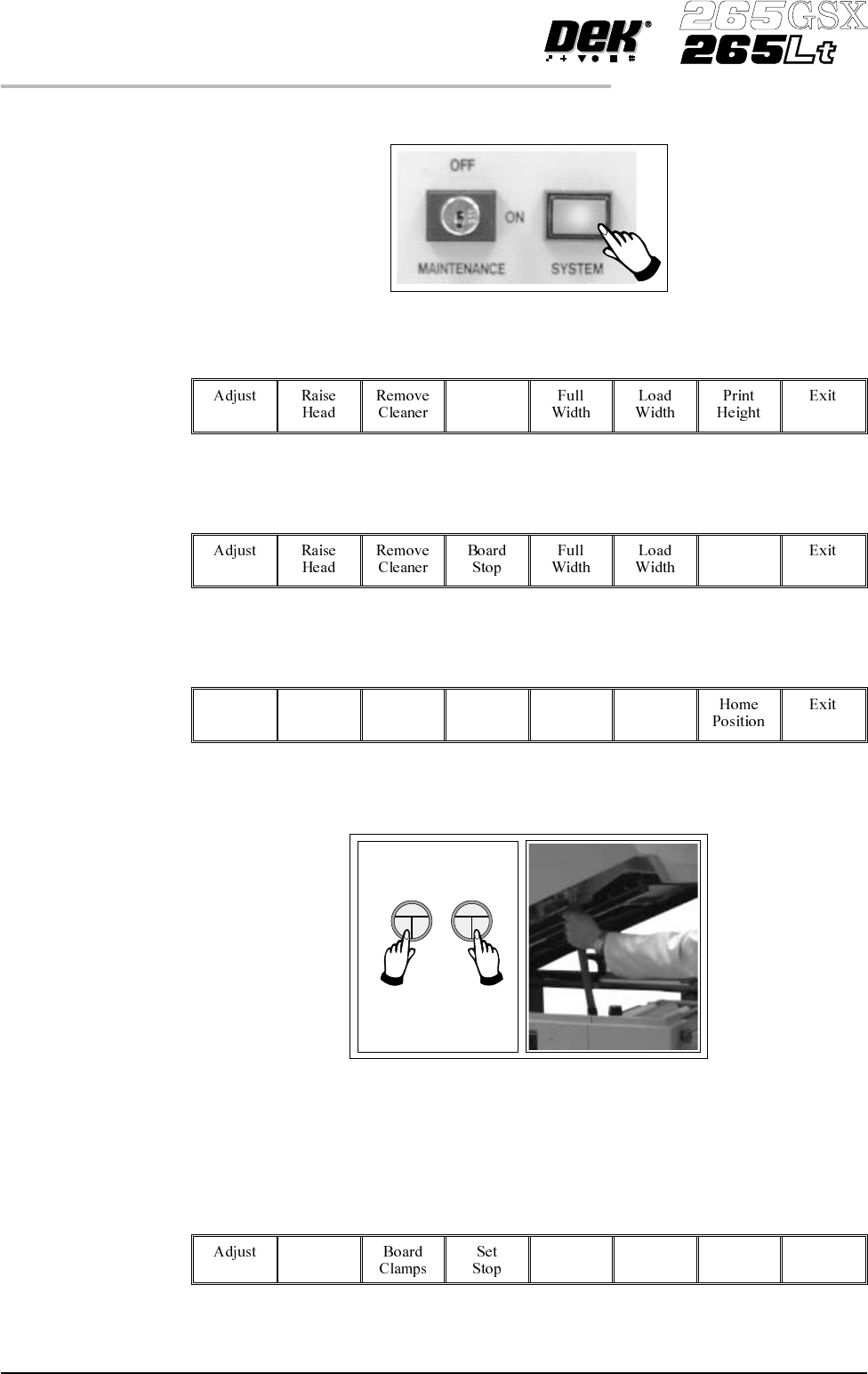 21. Press the System button. 22. Select Home Camera (F4). Home Camera 23. Select Print Height (F7). Print Height 24. Select Raise Head (F2). Raise Head 25. Raise the printhead using two button control. Fit the head prop.…