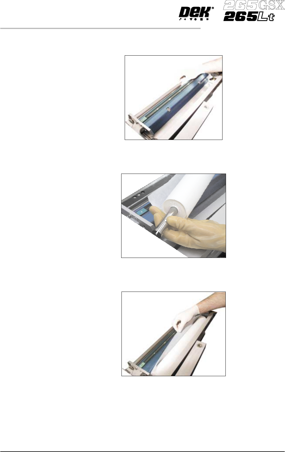 12. Feed the cleaner paper across the body assembly, ensuring the cleaner paper is aligned parallel to the unit end plate. 13. Insert the paper roll rod into the right hand flange of the shaft. Lay the rod along the shaf…