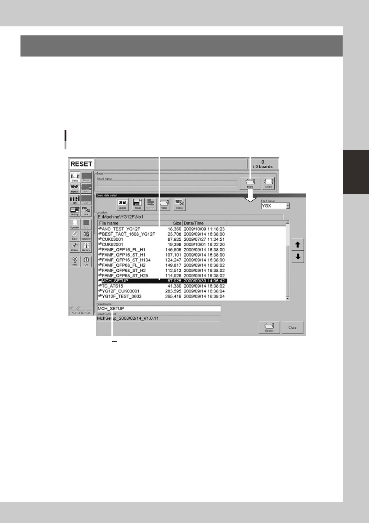 1. When the board data is not yet selected, press the [Board] button on the Setup screen.