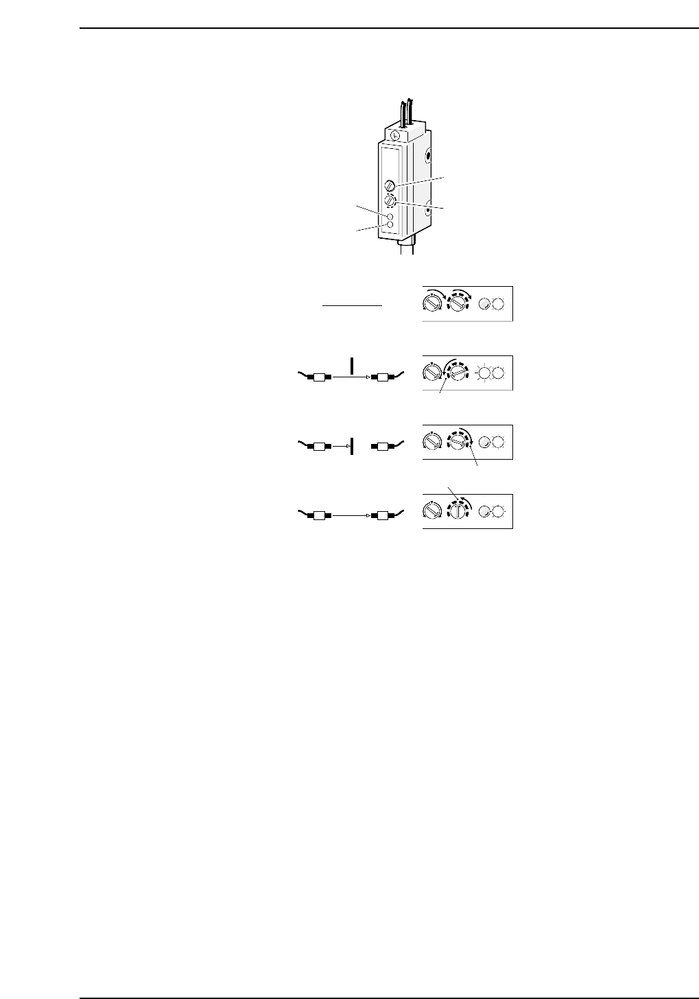 Sensor Sensitivity Adjustment 1. Rotate volumes 1 and 2 all the way to the right. 2. Pass the beam to the receiver. Slowly rotate volume 2 to the left until the red LED (position A) lights up. 3. Break the light beam wit…