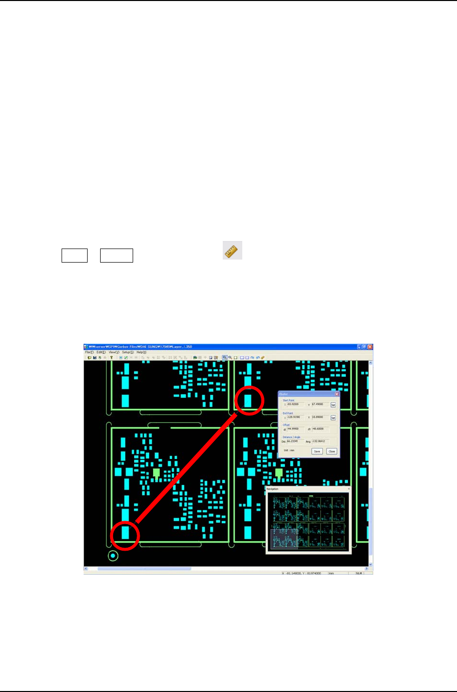 자 기능은 이용하면 플래쉬, 트레이스 혹은 패드 간의 거리를 측정할 수 있다. 이 기능은 기