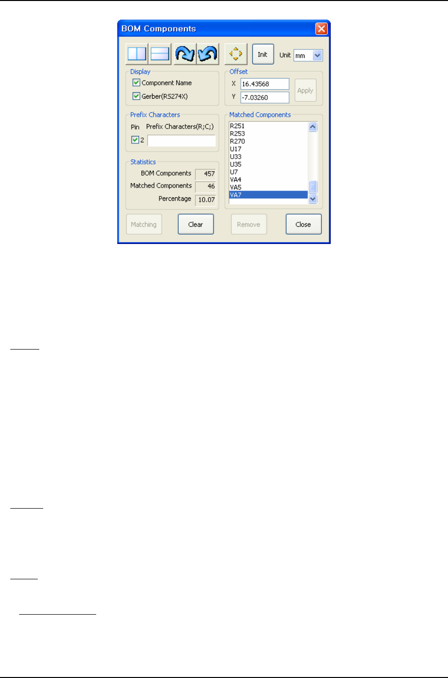 GerberWorks 티칭 프로그램 SPI HS60 Series 52 REV 1.2 [ 그림 3- 38] BOM 파일을 불러온 후의 화면 [그림 3-39] BOM 매칭이 완료된 모습 BOM 파일을 이용한 컴포넌트 등록 작업은 패드 추출 작업 후에 가능하다. 따라서 BOM 파일을 Import 하기 위해서는 패드 추출 작업이 우선되어야 한다.