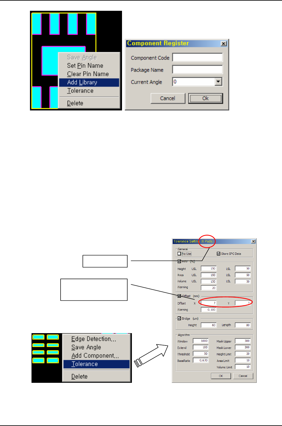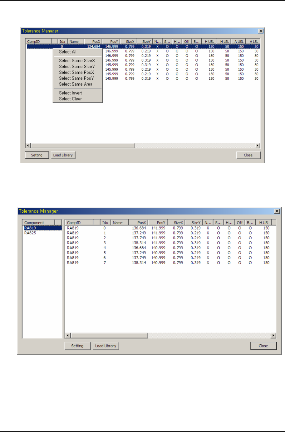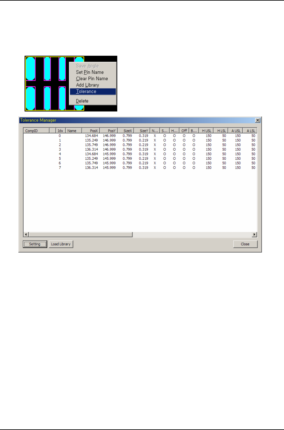 3. Ger berworks 티칭 프로그램 의 작 업 과정 PARMI CO., LTD. 65 REV 1.2 컴포넌트로 구성된 패드들의 검사 규격 관리 컴포넌트를 선택하고 Tolerance 메뉴를 선택하면 Tolerance Manager가 활성화 되고 Manager 상에서 검사 규격을 관리할 수 있다. [그림 3-54] 컴포넌트 구성 패드 리스트
