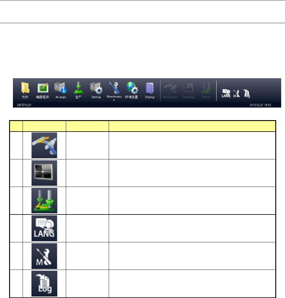 操作手册 1- 14 1-4- 4 菜单、功能按钮 本机的操作画面上的 可通过 菜单 、 以及 功能按钮进行 操作。 1-4- 4 - 1 功能按钮的构成 RS-1 在操作区域及信息 区域除了菜单以 外,还配置 有功能按钮。 (1) 操作区域的功能 按钮 操作区域的功能按钮 配置在以下位置。 任何按钮都有可能无 法通过起动中的应 用程序选择。 No. 图标 名称 概要 1 简易控制 从当前起动的应用程 序可运行简易控制 时,进入简易 控…