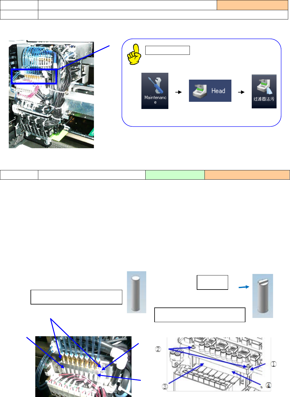 1) 请目检确认 Head 单元正面部位过滤器箱内的「空气过滤器①」没有脏污。