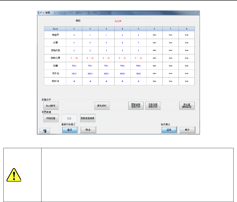 如果勾选了操作选项的[无元件暂停后,重新运行时跟踪吸取]选项,则在重新开始生产前,会显示设