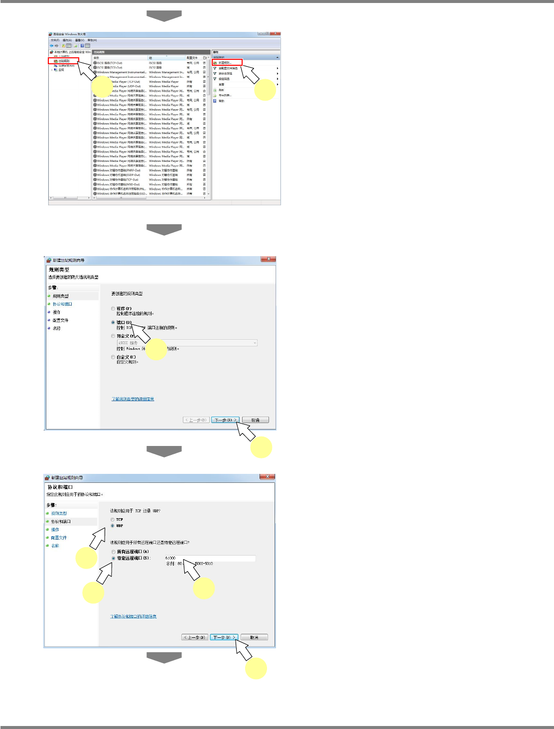 NPM-DGS 程序手册 2.1 NPM-DGS 的安装 EJS9AC-MB-02P-15 Page 2-89 15 点击左侧的 [ 出站规则 ] 。 16 点击右侧的 [ 新建规则 ] 。 17 点击‘端口 ’ 的复选框按钮。 18 点击 [ 下一步 ] 。 19 点击‘ UDP’ 的复选框按钮。 20 点击‘特定远程端口 ’ 的复选框按钮。 21 在‘特定远程端口 ’ 中输入 ’61000 ’。 22 点击 [ 下一步 ] 。 In…