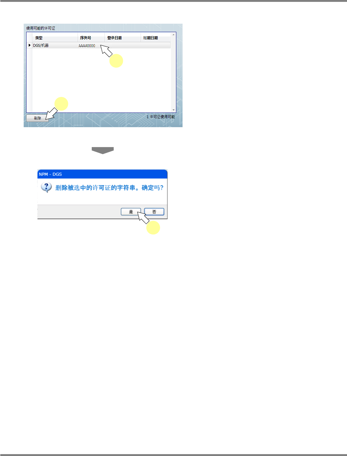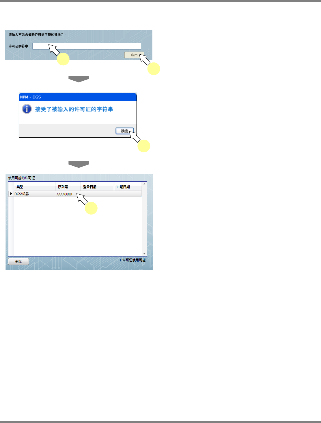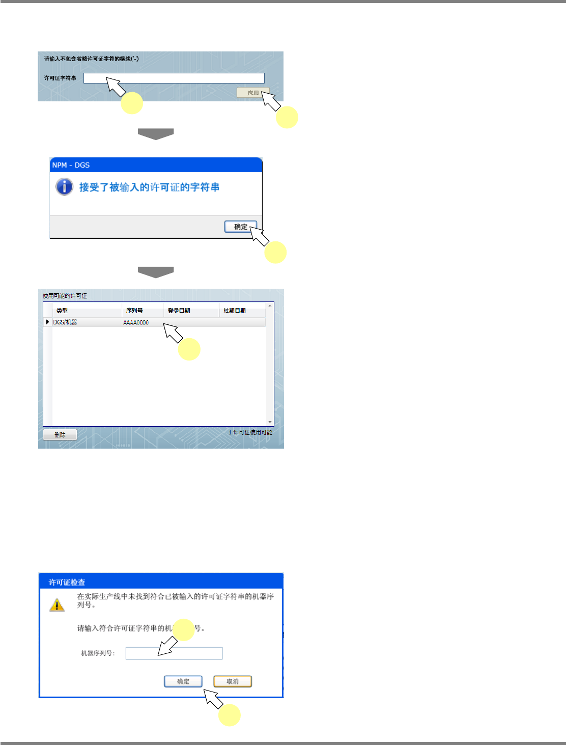NPM-DGS 程序手册 3.2 关于环境设定画面 Page 3-6 EJS9AC-MB-03P-13 离线元件数据编制许可证的设定方法 使用离线相机单元,无需设定许可证 。 1 在 [ 许可证字符串 ] 文本框里输入许可证 列表上所记载的离线元件数据编制的 许可证字符串。 ( 选项表中记载的选项 编号 ) 2 点击 [ 应用 ] 。 3 点击 [ 确定 ] 。 4 对 [ 使用可能的许可证 ] 栏里显示的许可 证列表追加在上述…