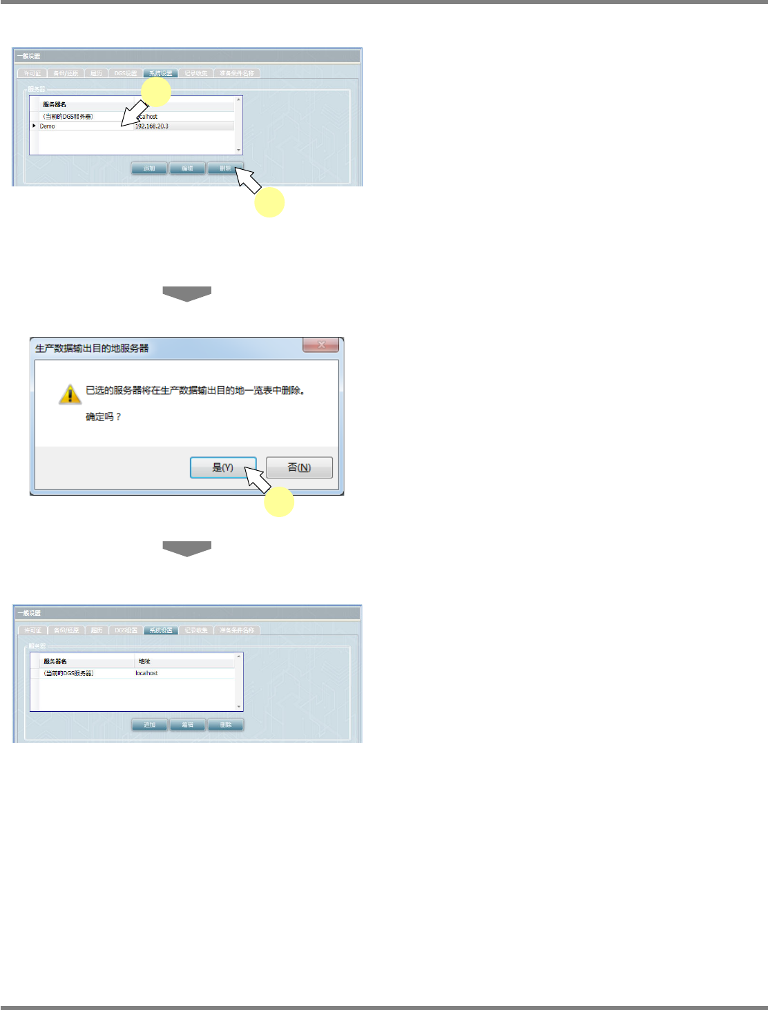 NPM-DGS 程序手册 3.2 关于环境设定画面 EJS9AC-MB-03P-13 Page 3-31 服务器的编辑 1 从服务器一览中选择想要编辑的服务 器。 2 点击 [ 编辑 ] 。 将显示 < 生产数据输出目的地服务器编缉 > 画 面。 3 输入 ' 服务器名 ' 和 ' 地址 ' 。 除了可使用数字 IP 地址以外, 地址还可设为连 接目的地的 PC 名称。 不…
