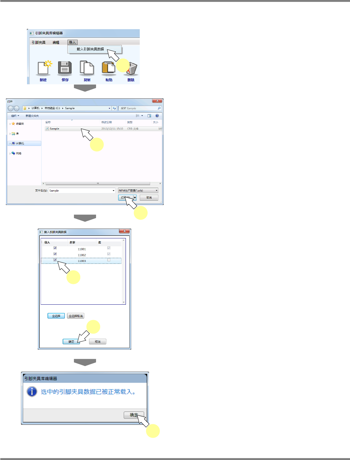 NPM-DGS 程序手册 4.9 引脚夹具库编辑器 Page 4-108 EJS9AC-MB-04P-29 4.9.7 引脚夹具的导入 1 选择菜单栏的 [ 导入 ] → [ 载入引脚夹具 数据 ] 。 2 选择需要导入的生产数据。 3 点击 [ 打开 ] 。 将显示确认画面。 4 勾选需要导入的引脚夹具。 5 点击 [ 确定 ] 。 6 点击 [ 确定 ] 。 Factor y 041100S-20C0 0 4 5 Factory…