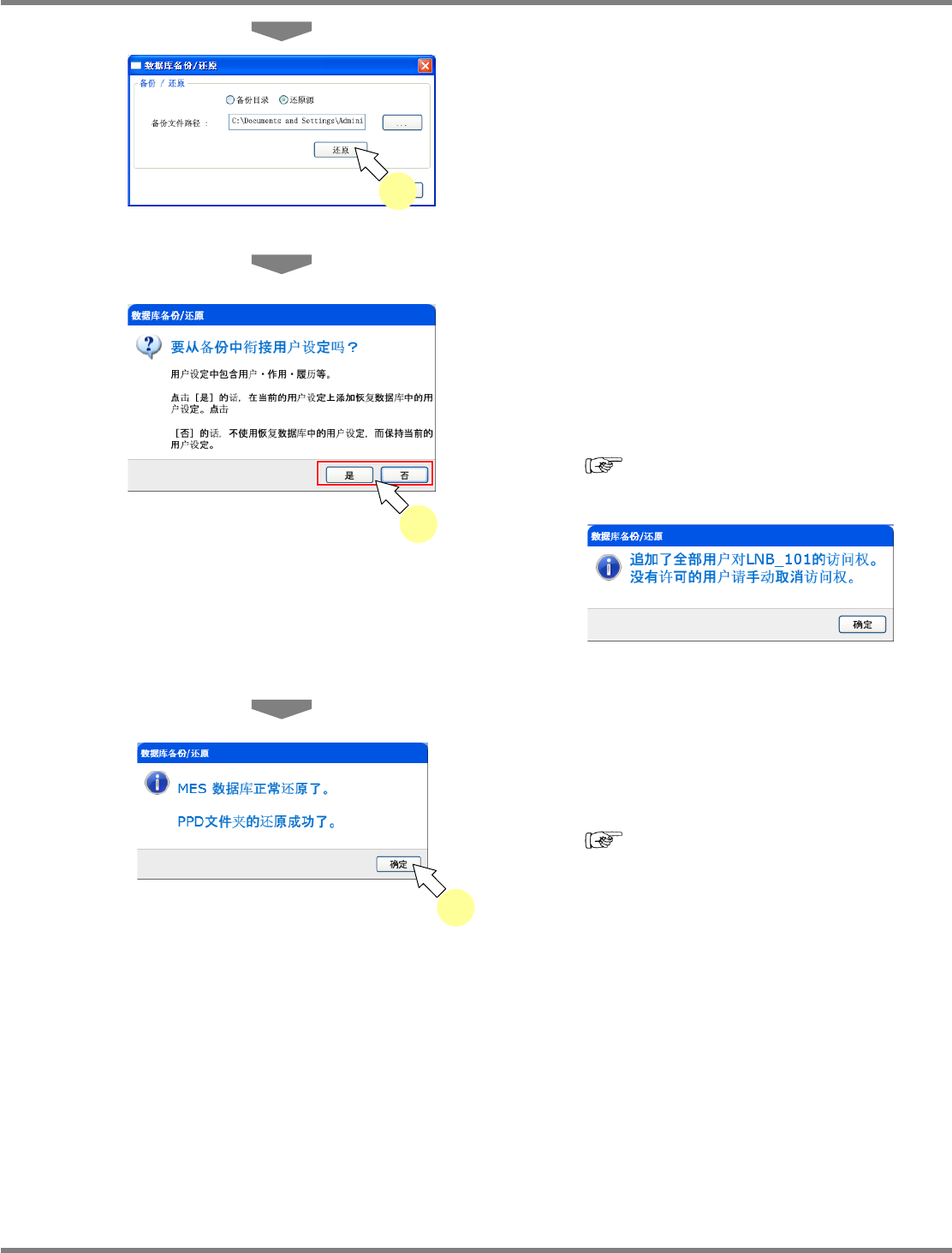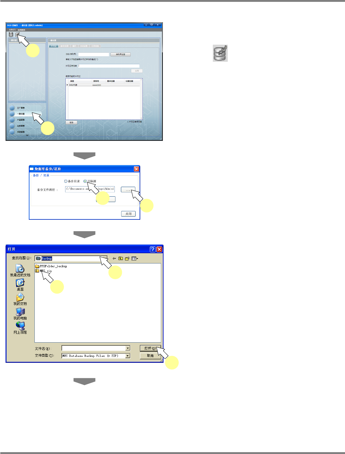 NPM-DGS 程序手册 3.2 关于环境设定画面 Page 3-10 EJS9AC-MB-03P-13 ② 通过 [ 数据库备份 / 还原的启动 ] 进行还原 1 选择 [ 一般设置 ] 。 2 点击 。 显示出 < 数据备份 / 还原 > 画面。 3 选择 ‘ 还原源 ’ 。 4 点击 [...] 。 显示出 < 打开 > 画面。 5 指定还原源文件所在的目录。 6 指定还原文件。 7 点击 [ 打开…