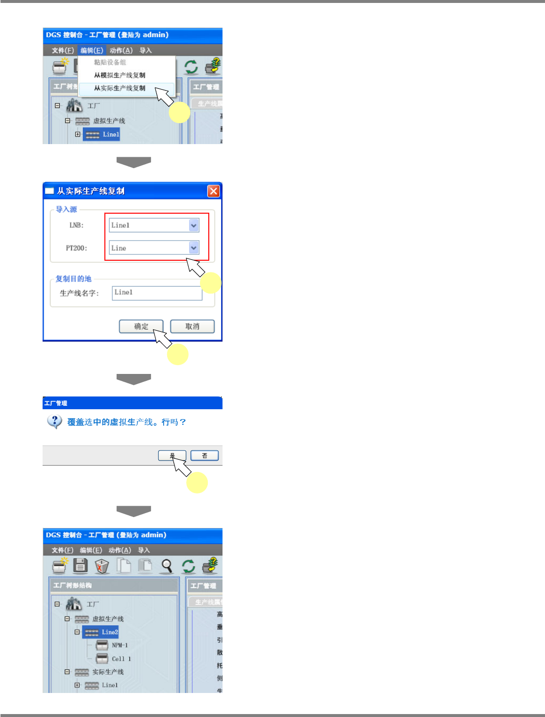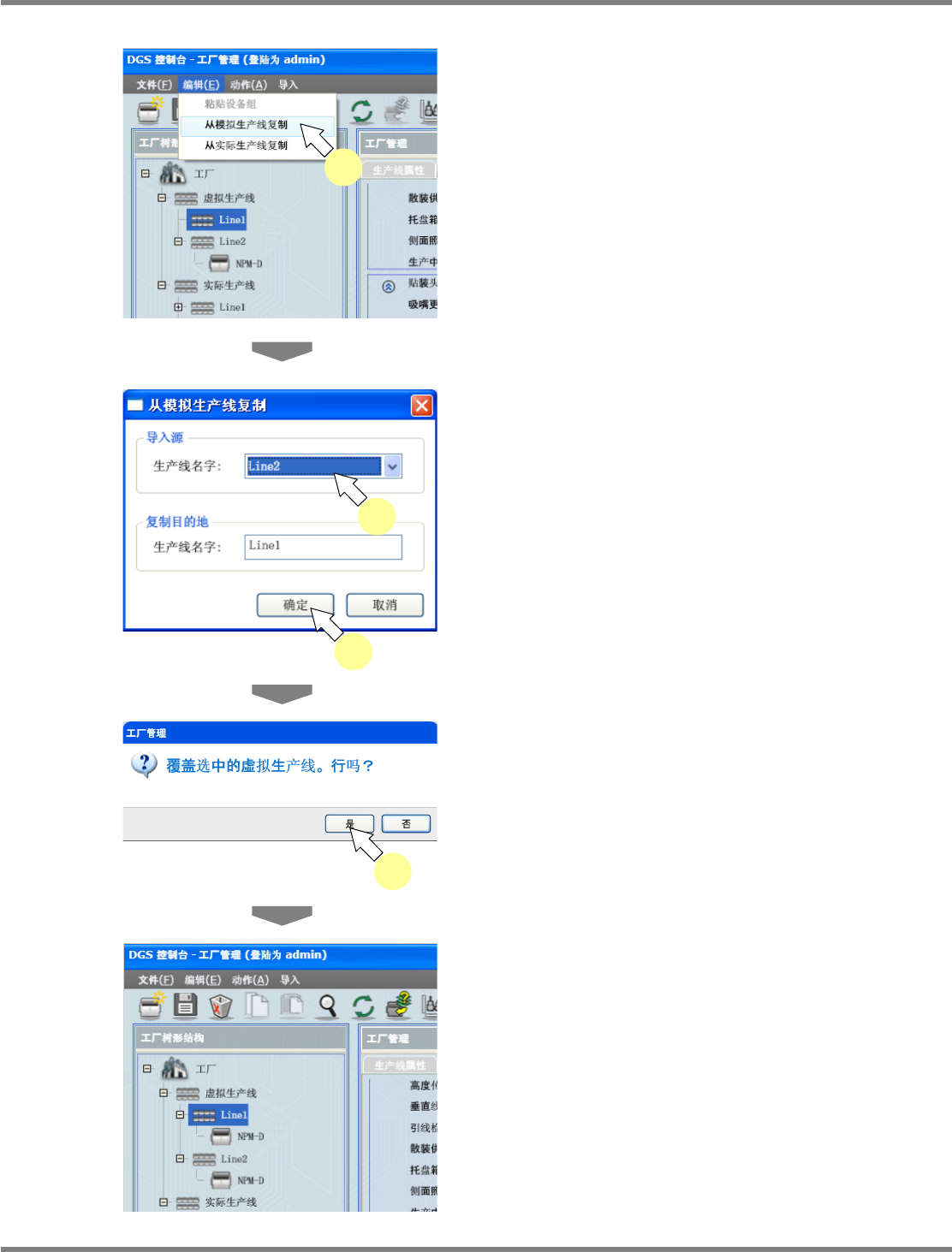 NPM-DGS 程序手册 4.3 假想生产线的构筑 Page 4-8 EJS9AC-MB-04P-29 实际生产线的复制 1 在树形视图上选择复制目的地的模拟 生产线后右击, 从右击菜单上选择 [ 从实 际生产线复制 ] , 或选择复制目的地的生 产线后再选择菜单栏的 [ 编辑 ] [ 从实 际生产线复制 ] 。 显示出 < 从实际生产线复制 > 画面。 2 从一览中选择导入源的生产线名称。 只编制 NPM …