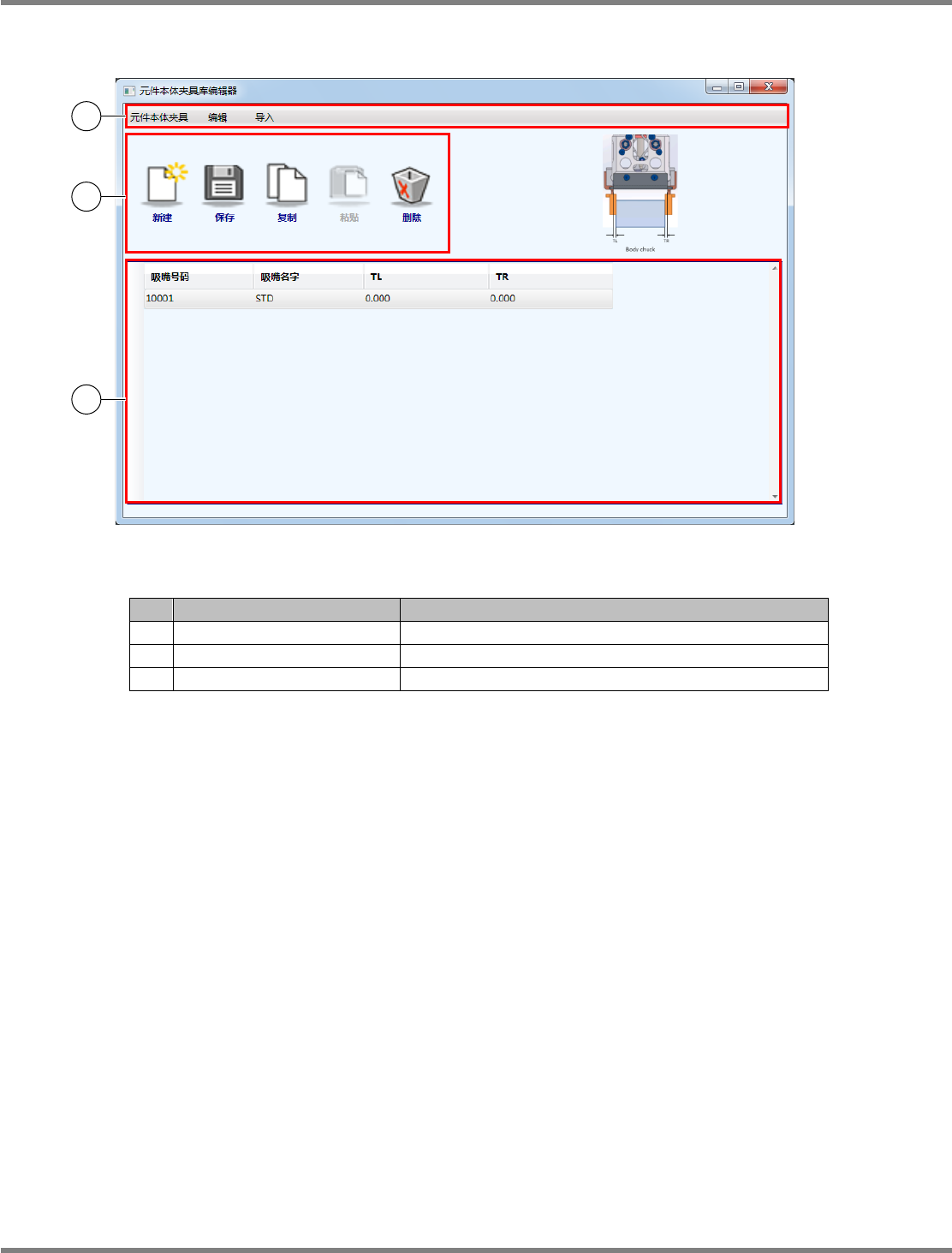 NPM-DGS 程序手册 4.8 元件本体夹具库编辑器 Page 4-94 EJS9AC-MB-04P-29 4.8.2 元件本体夹具库编缉器画面的构成 No. 名称 说明 菜单栏 显示各个菜单。 工具栏 显示各操作图标。 工具一览显示区域 显示工具数据的详细内容。 Factory041000S-0 4C00 2 1 2 2 2 3