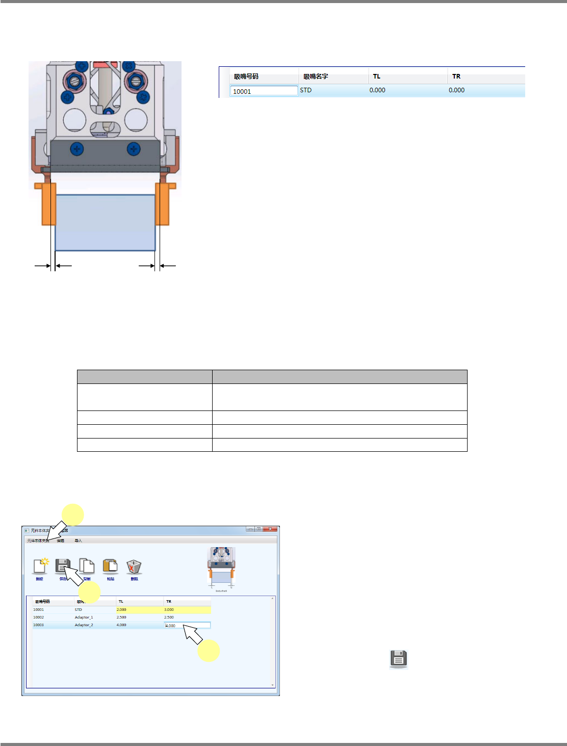 NPM-DGS 程序手册 4.8 元件本体夹具库编辑器 Page 4-96 EJS9AC-MB-04P-29 4.8.3 元件本体夹具数据 在这里对元件本体夹具数据的详细内 容进行说明。 元件本体夹具数据的设定项目 项目 说明 ‘吸嘴号码’ 表示元件本体夹具适配器的设置号码 。 ・ 在 10001 ~ 10999 的范围内进行设定。 ‘吸嘴名字’ 显示元件本体夹具的名称。 ‘ TL ’ 左侧适配器的厚度 ‘ TR ’ 右侧适配器的厚…