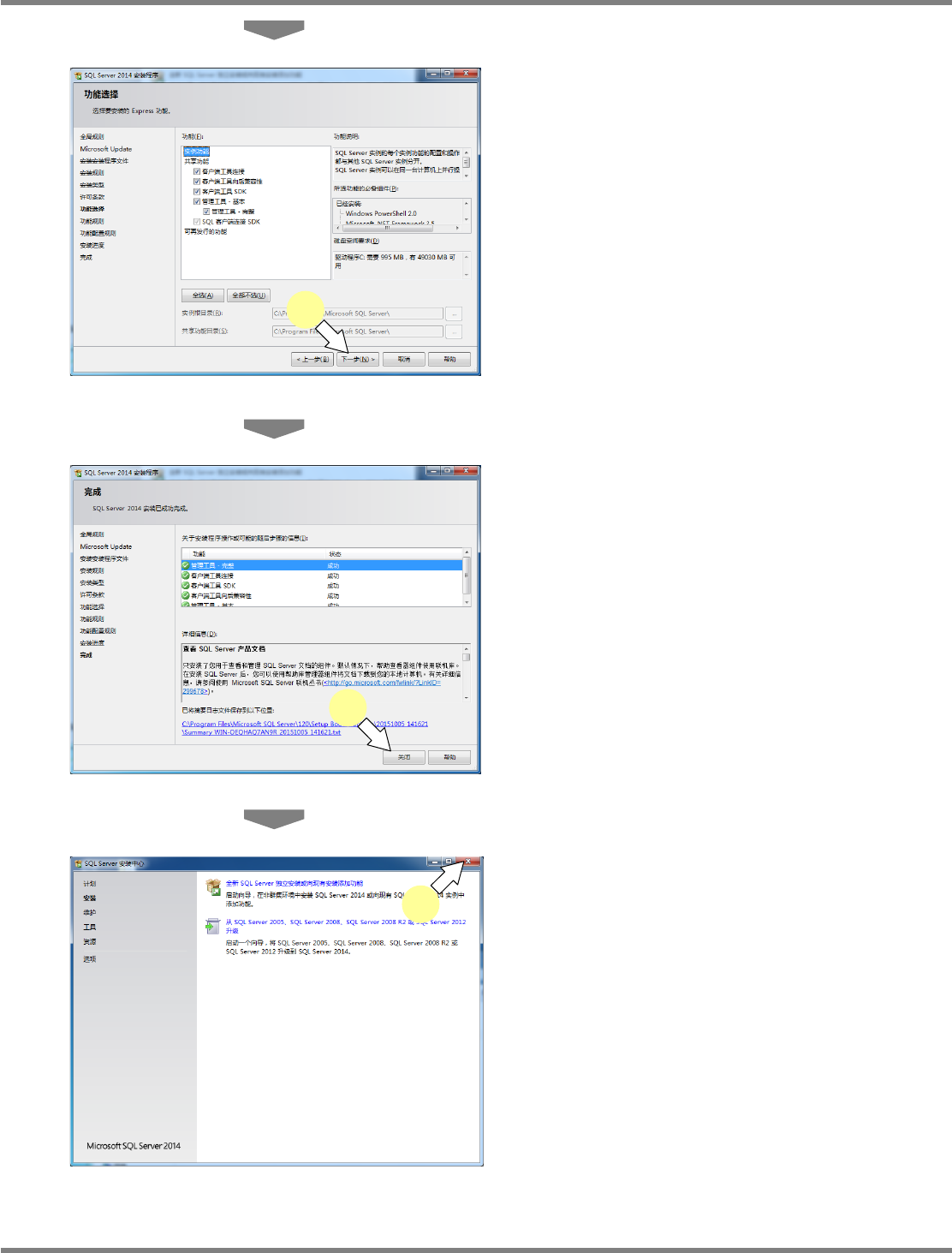 NPM-DGS 程序手册 2.1 NPM-DGS 的安装 EJS9AC-MB-02P-15 Page 2-29 8 点击 [ 下一步 ] 。 9 点击 [ 关闭 ] 。 10 关闭 <SQL Server 安装中心 > 画面。 接下来,请按照“ 2.1.9 SQL Server 2014/2012/2008 的设定”的内容进行 SQL Server 的设定。 Install020101S-9 3C00 8 Install…