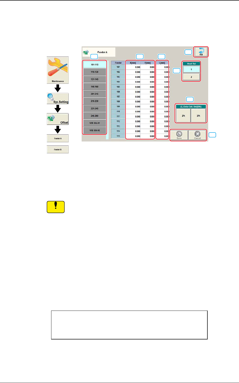 DEUKYX 2-23 193-3100 2.3 Feeder A/ Feeder B 2.3 Feeder A/ Feeder B Wird der [Feeder A]- oder [Feeder B]-Tab im Bildschirm "Offset Data" gedrückt, öffnet sich der folgende Bildschirm. Grafischer Ablauf or [1] [2…