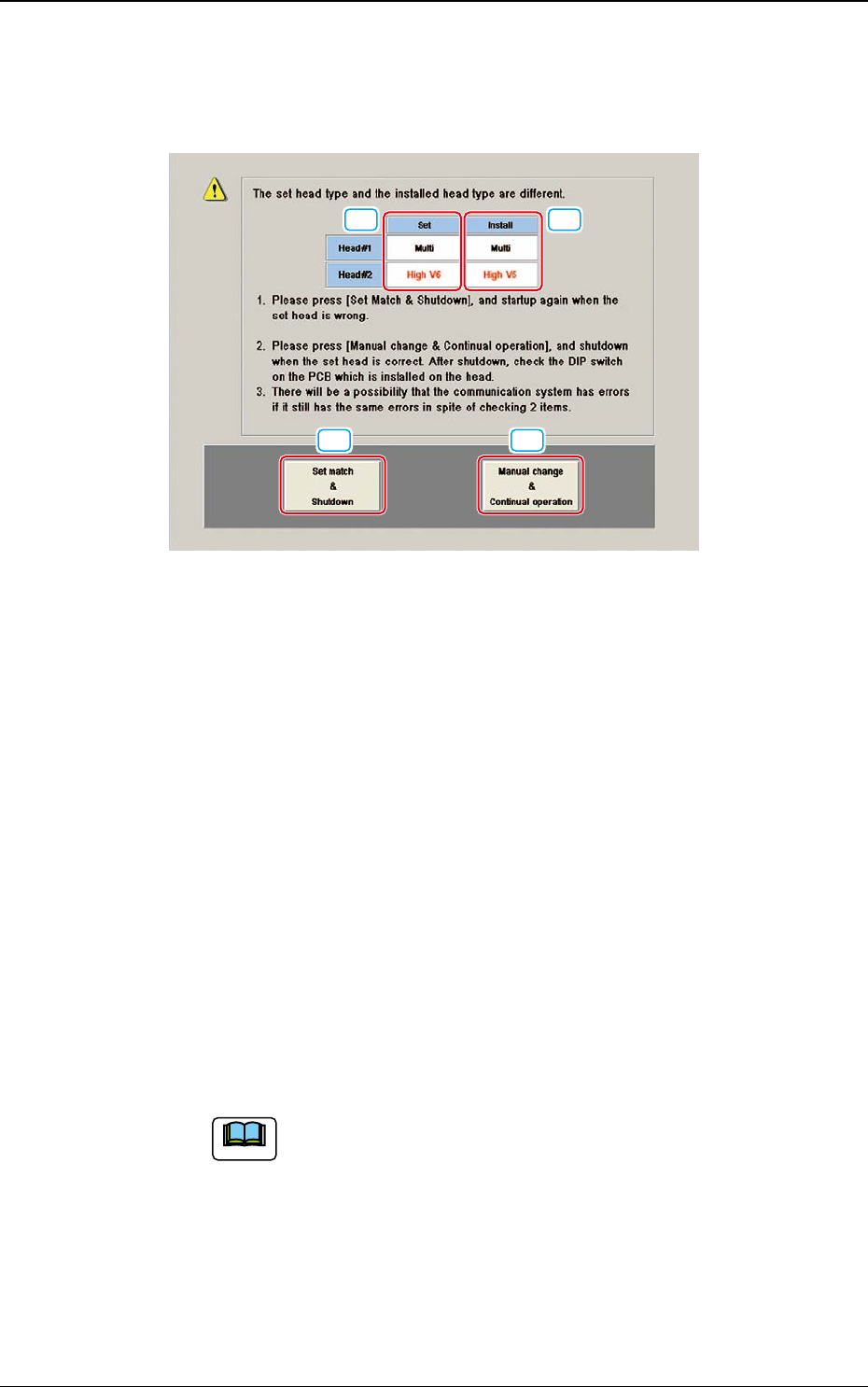 DEUKYX 1-6 193-3100 3.1 Kopfeinheit 3.1.1 Prüfbildschirm Montierter Kopf Dieser Bildschirm wird angezeigt, wenn der vorgegebene Kopf nicht dem installierten Kopf entspricht. [1] [3] [4] [2] F3A7 [1] Set In diesem Feld wi…