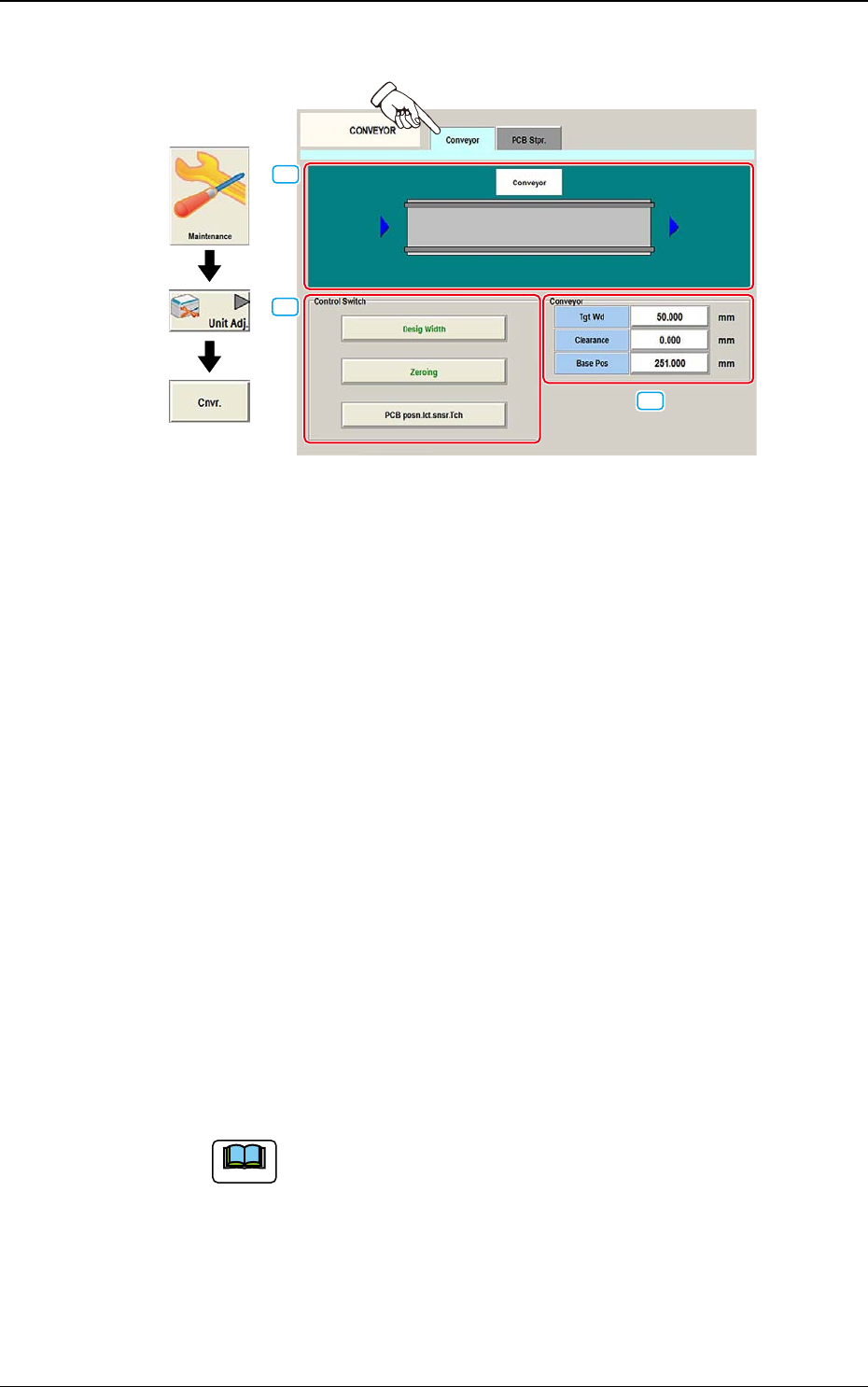 DEUKYX 1-22 193-3100 4.3 CONVEYOR [3] [Conveyor]-Setup-T asten Wenn in die Zielposition gefahren wurde, wird die Transportbreite mit den folgenden Tasten eingerichtet. [Tgt Wd]-T aste Wird die Schaläche gedrückt, ersche…