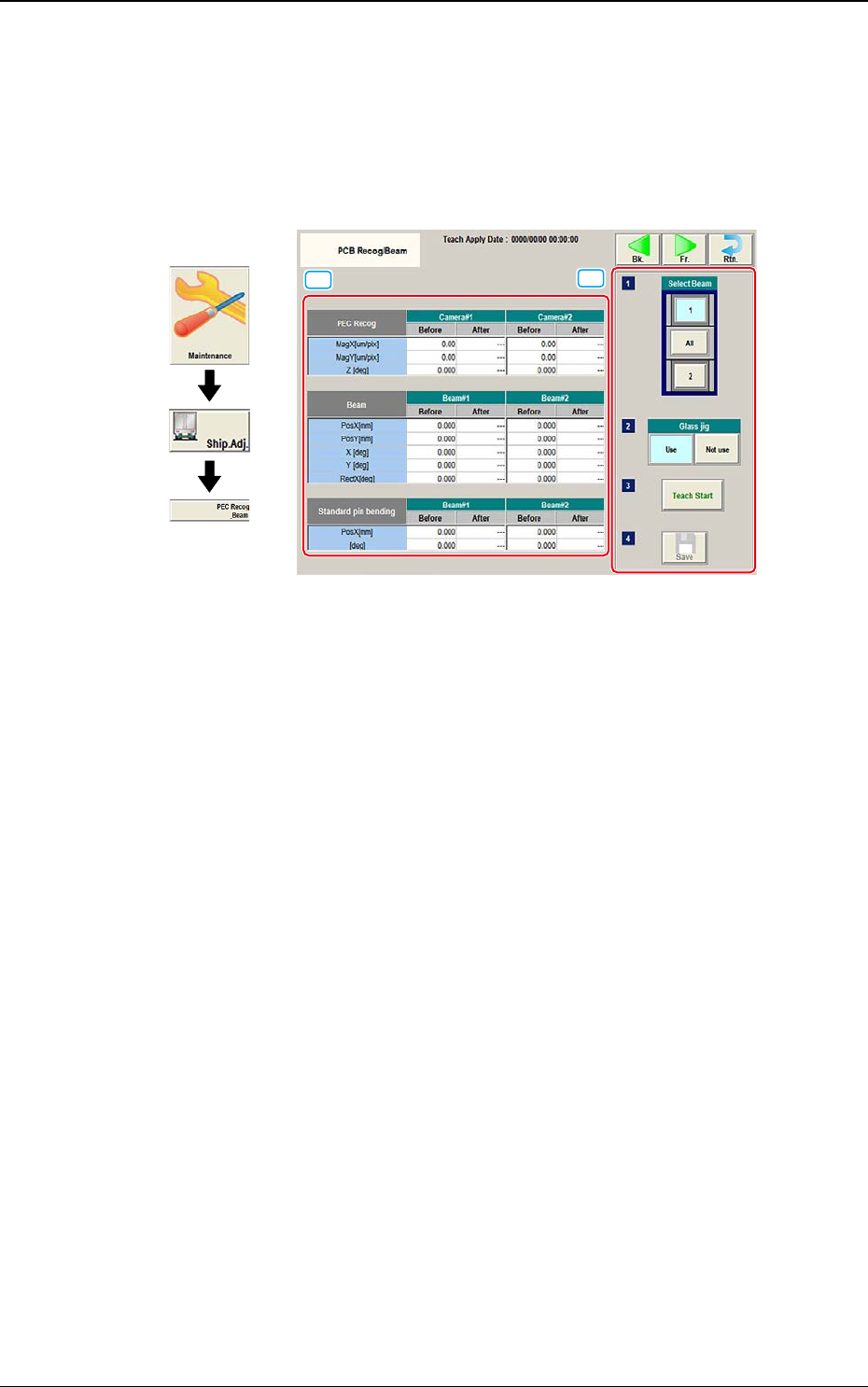DEUKYX 1-43 193-3100 5.8 PCB Recog/Beam 5.8 PCB Recog/Beam Der Bildschirm bietet die Funktionen für das Teachen der Offsets der PEC- Erkennungskamera (Vergrößerungen X (horizontal), Y (vertikal) und Z (Winkel) und die Of…