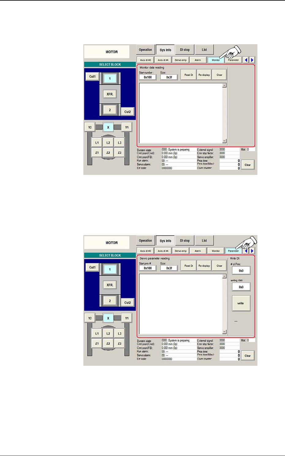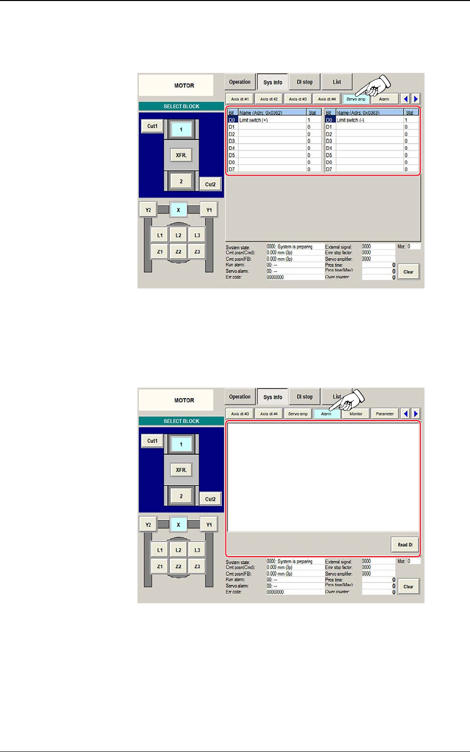 Wird im Bildschirm "Sys Info" der Tab [Servo amp] gedrückt, erscheint