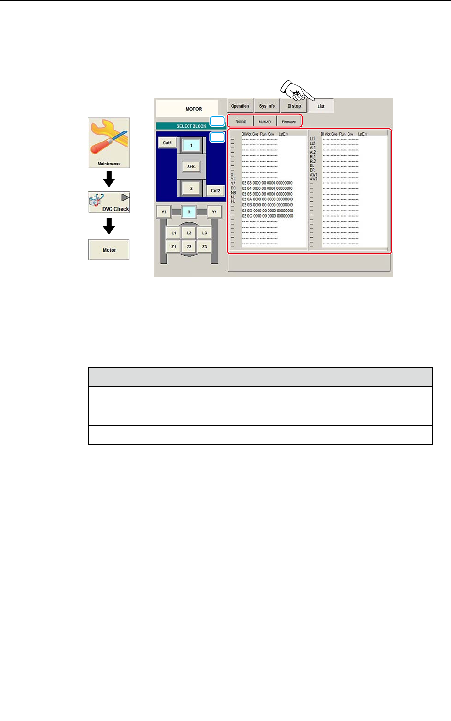 DEUKYX 1-87 193-3100 6.2 MOTOR 6.2.4 List Drücken Sie [List] im Bildschirm "MOTOR" wird der folgende Bildschirm angezeigt. Auf dem Bildschirm erscheint eine Status-Liste der einzelnen Bereiche. Grafischer Ablau…