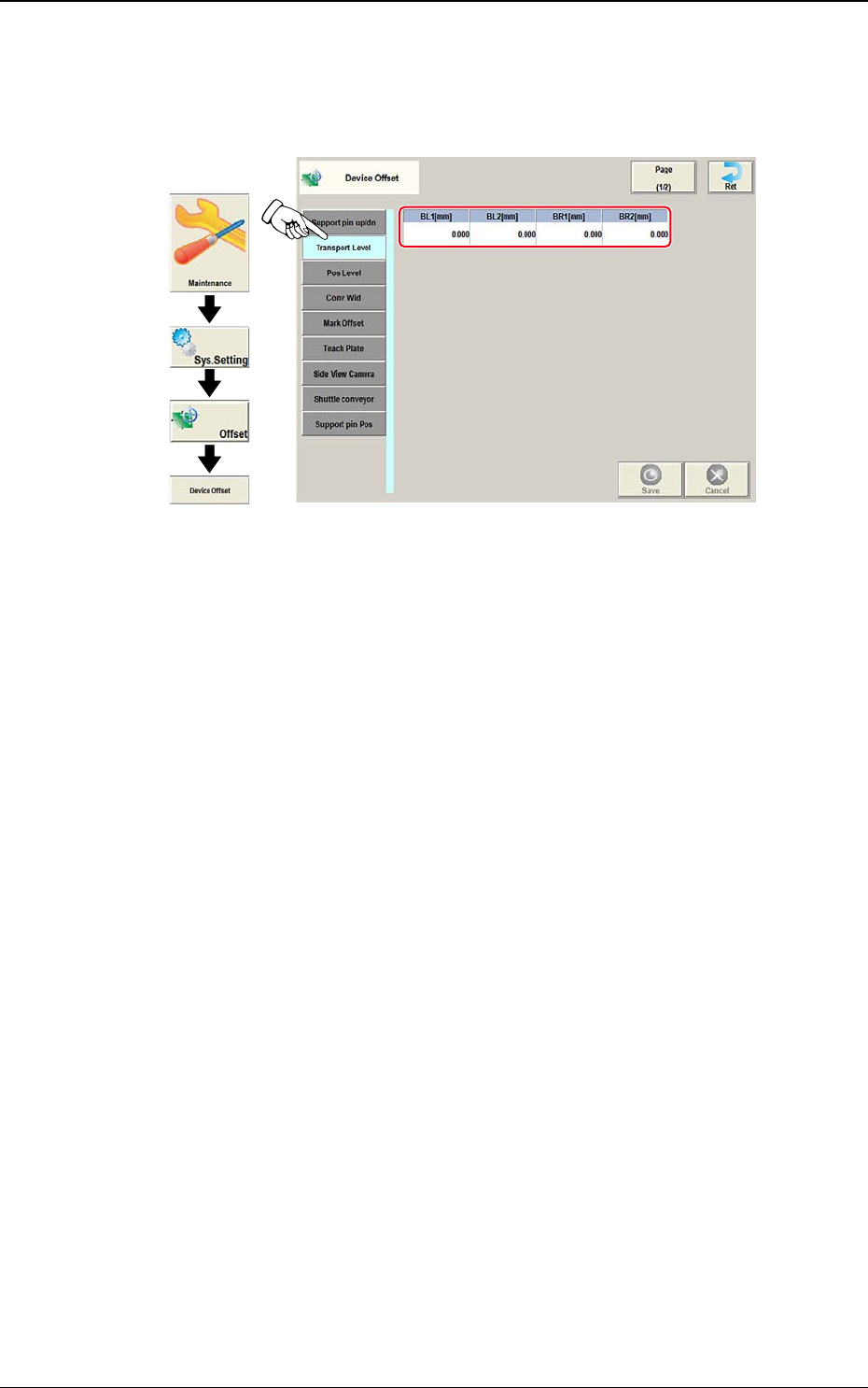 DEUKYX 2-6 193-3100 2.1 Device Offset 2.1.2 T ransport Level Wird der [Transport Level]-Tab im Bildschirm "Device Offset" gedrückt, öffnet sich der folgende Bildschirm. Grafischer Ablauf F3B5 BL1 [mm] / BL2 [mm…