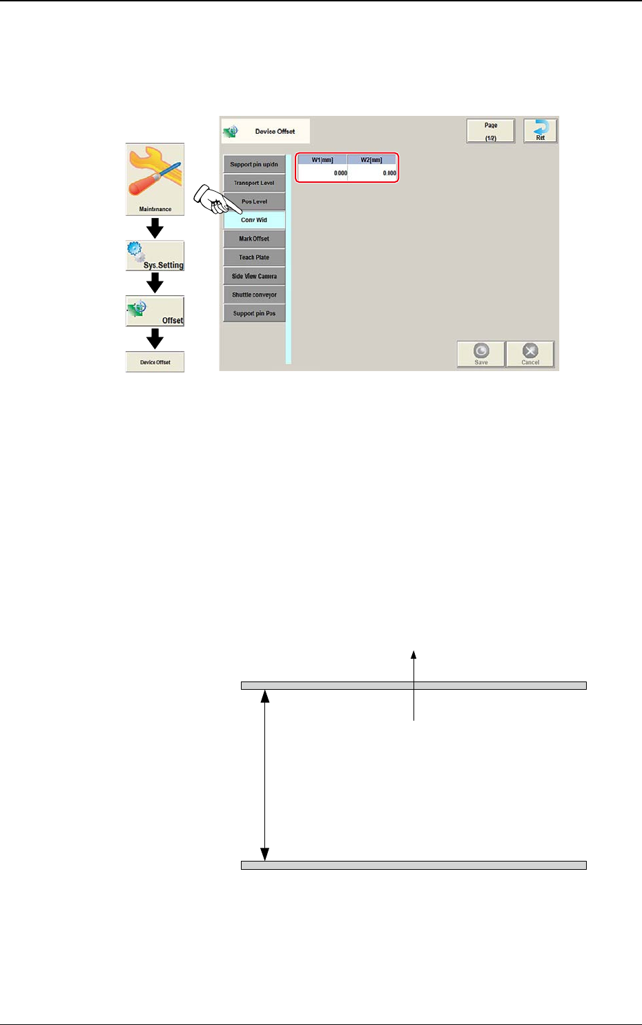 DEUKYX 2-8 193-3100 2.1 Device Offset 2.1.4 Conv Wid Wird der [Conv Wid]-Tab im Bildschirm "Device Offset" gedrückt, öffnet sich der folgende Bildschirm. Grafischer Ablauf F3B7 W1 [mm], W2 [mm] Diese Offsetdate…