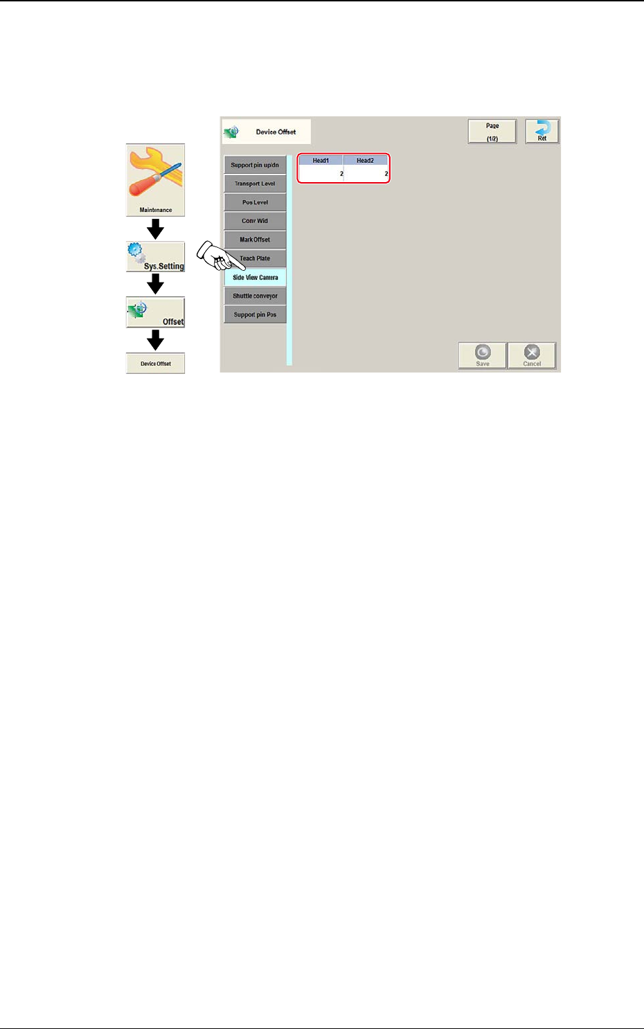 DEUKYX 2-11 193-3100 2.1 Device Offset 2.1.7 Side View Camera Wird der [Side View Camera]-Tab im Bildschirm "Device Offset" gedrückt, öffnet sich der folgende Bildschirm. Grafischer Ablauf F3B12 Head 1 / Head 2…