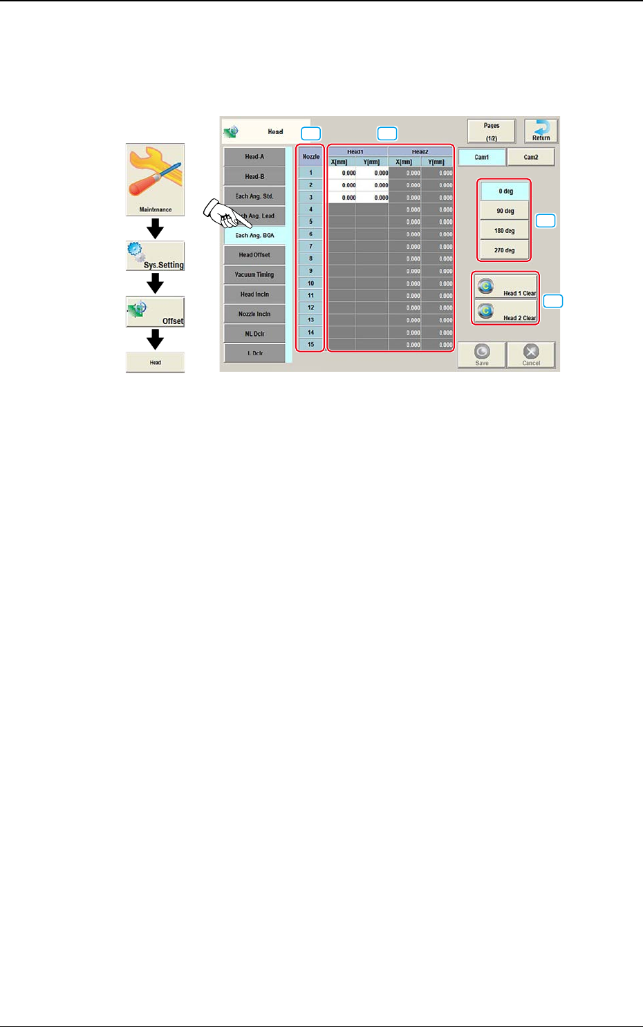DEUKYX 2-36 193-3100 2.5 Head 2.5.5 Each Ang. BGA Wird der [Each Ang. BGA]-Tab im Bildschirm "Head" gedrückt, öffnet sich der folgende Bildschirm. Grafischer Ablauf [1] [2] [3] [4] F3B36 [1] Nozzle 1 bis 15 In …