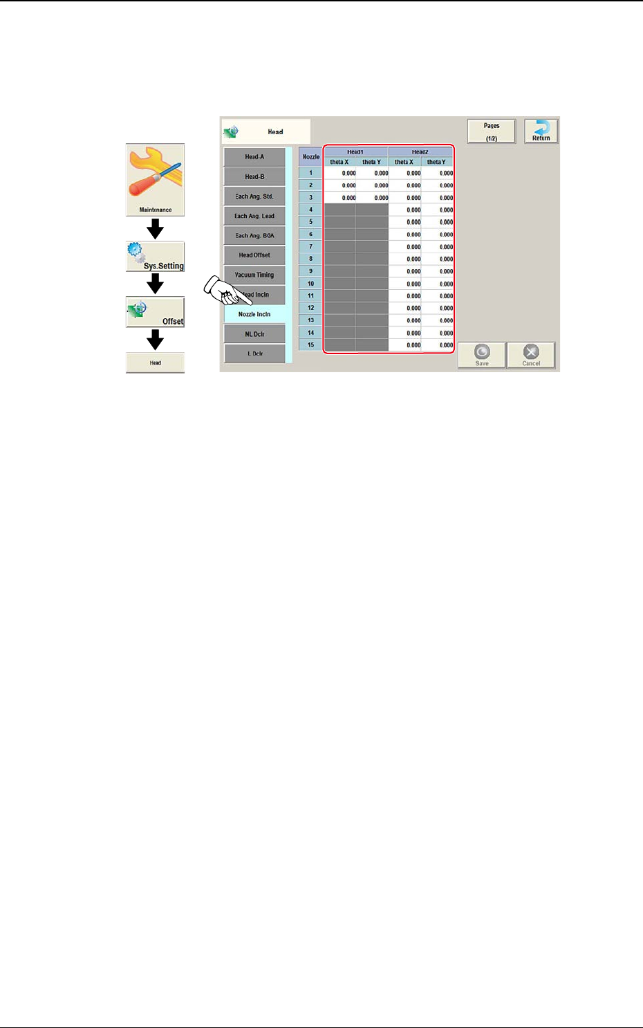 Wird der [Nozzle Incln]-Tab im Bildschirm "Head" gedrückt, öffnet sich der