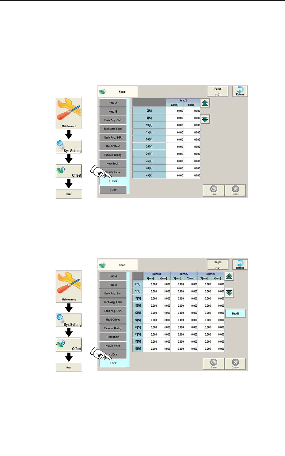 DEUKYX 2-44 193-3100 2.5 Head 2.5.10 NL Dclr Ist die Maschine mit einem High-Speed-Kopf ausgestattet, öffnet sich der folgende Bildschirm, wenn der [NL Dclr]-Tab im Bildschirm "Head" gedrückt wird. Die X/Y-Abwe…