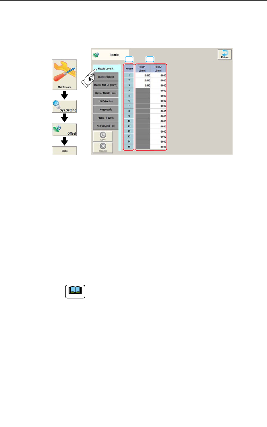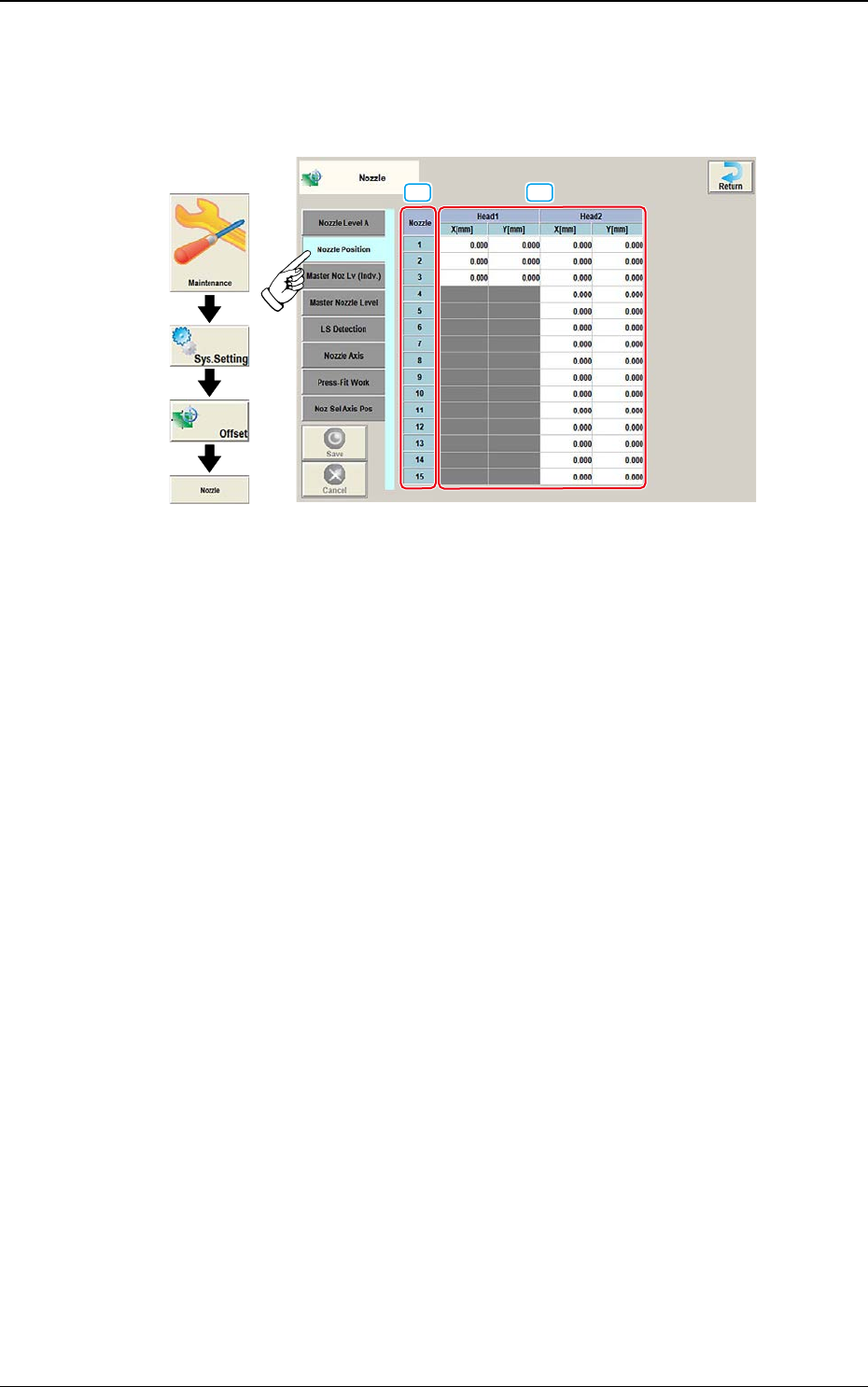 DEUKYX 2-48 193-3100 2.6 Nozzle 2.6.2 Nozzle Position Wird der [Nozzle Position]-Tab im Bildschirm "Head" gedrückt, öffnet sich der folgende Bildschirm. Grafischer Ablauf [2] [1] F3B48 [1] Nozzle In diesem Bere…