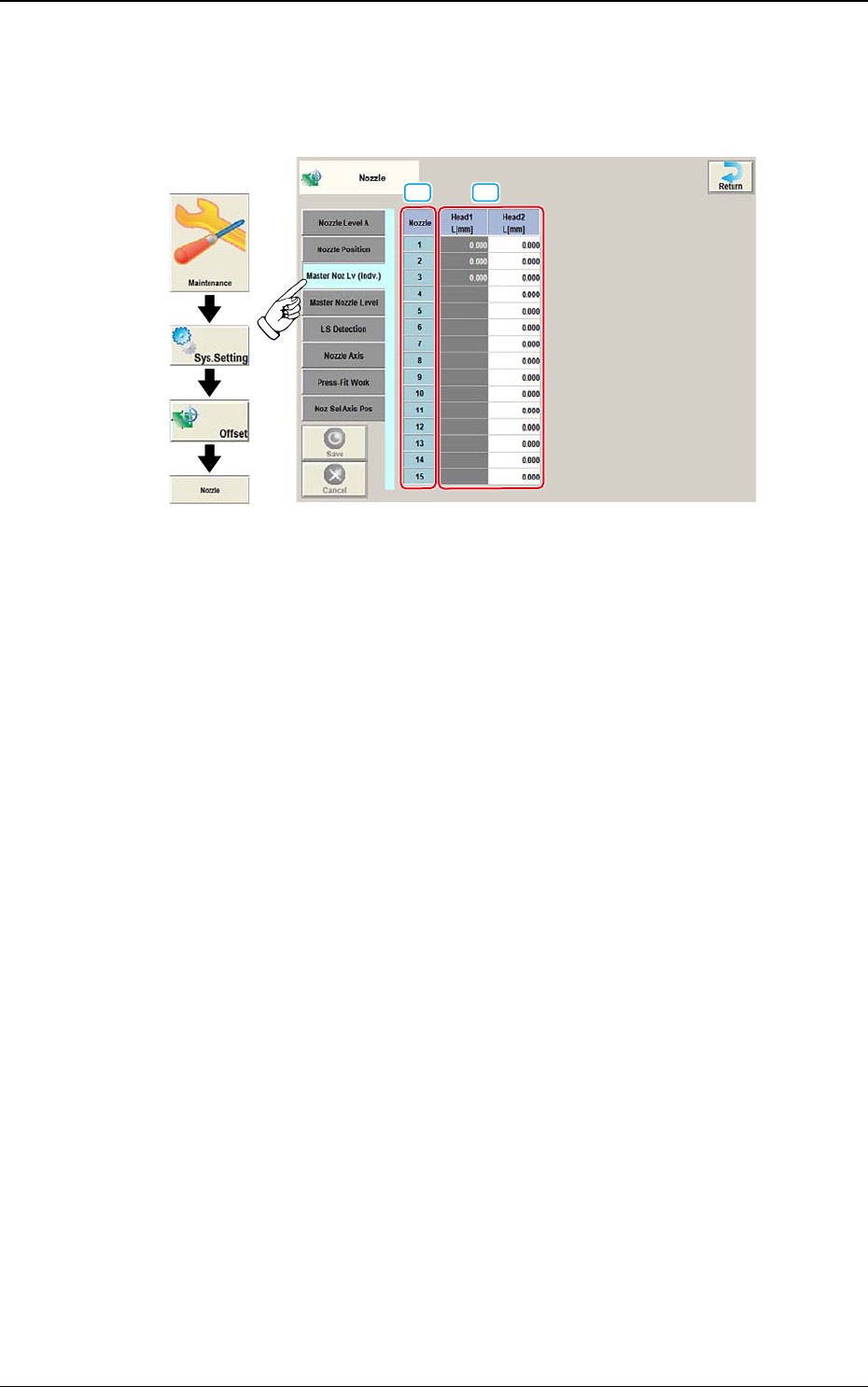 DEUKYX 2-50 193-3100 2.6 Nozzle 2.6.3 Master Noz Lv (Indv .) Wird der [Master Noz Lv (Indv.)]-Tab im Bildschirm "Nozzle" gedrückt, öffnet sich der folgende Bildschirm. Grafischer Ablauf [2] [1] F3B50 [1] Nozzle…
