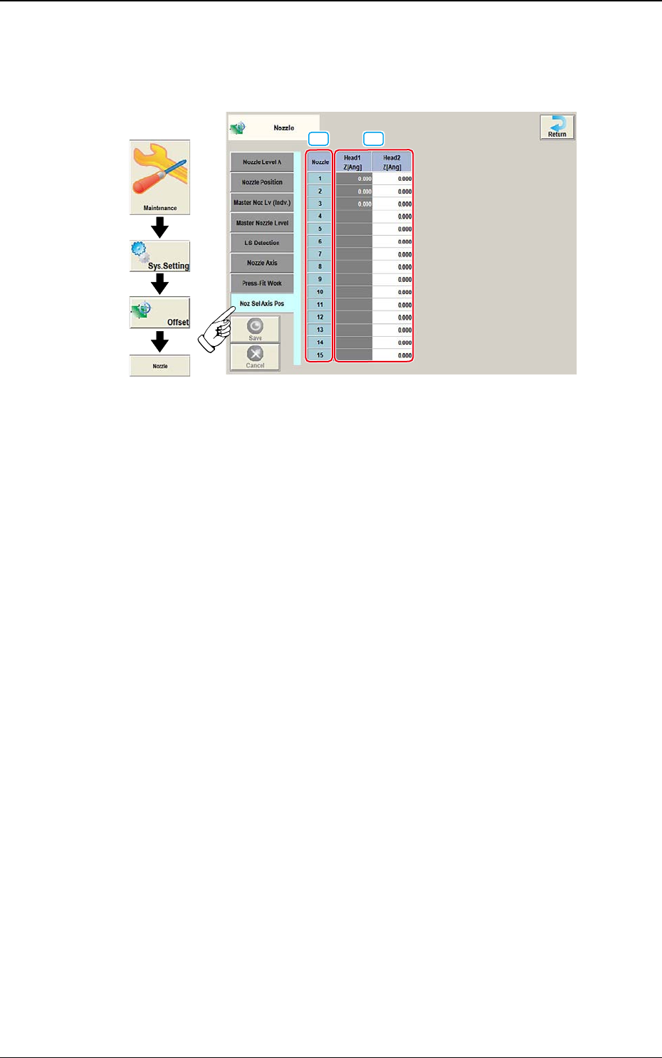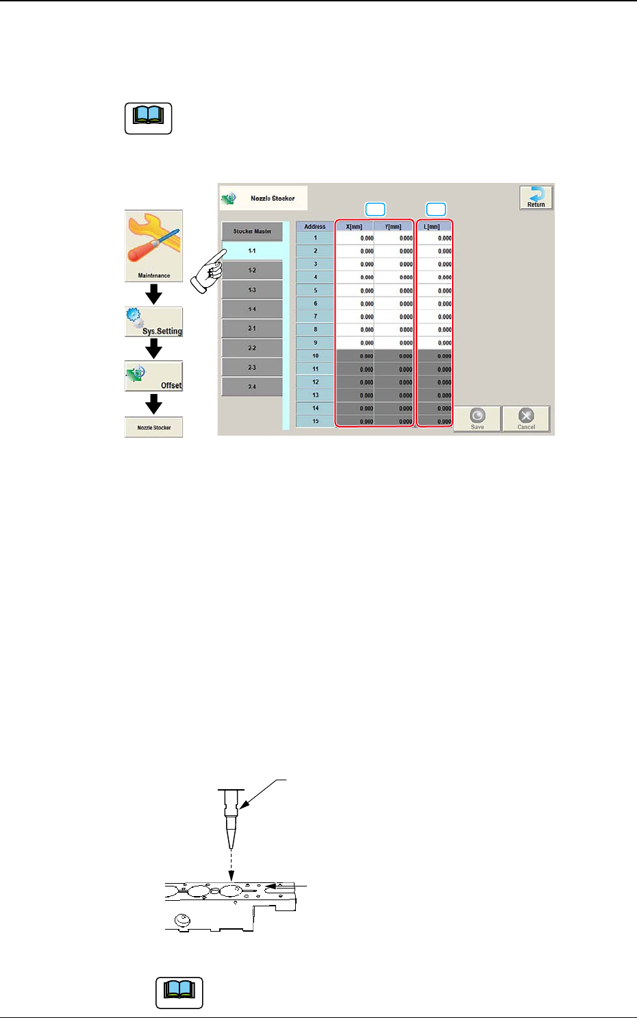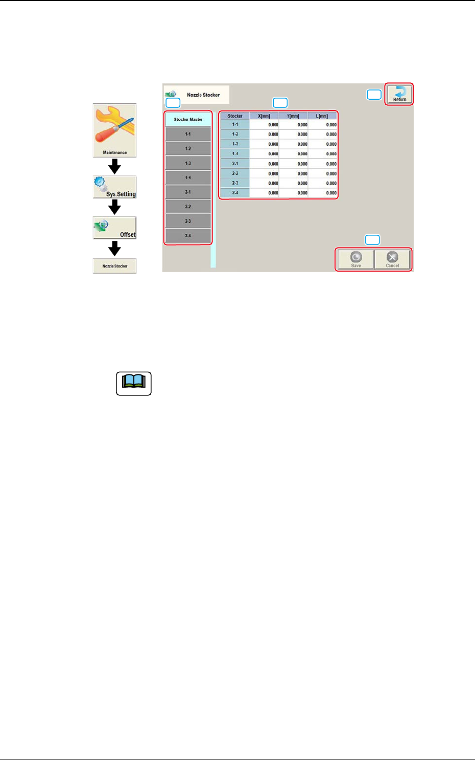 DEUKYX 2-56 193-3100 2.7 Nozzle Stocker 2.7 Nozzle Stocker Wird der [Nozzle Stocker]-Tab im Bildschirm "Offset Data" gedrückt, öffnet sich der folgende Bildschirm. Grafischer Ablauf [2] [3] [4] [1] F3B56 [1] Of…