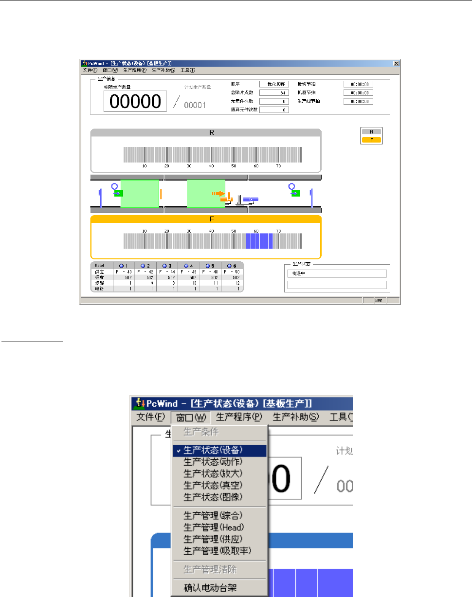 从窗口菜单的 [设备]、[动作] 、[扩充]、[真空]、[生产状态] 选择一项生产状态,即可显示指定的生产设