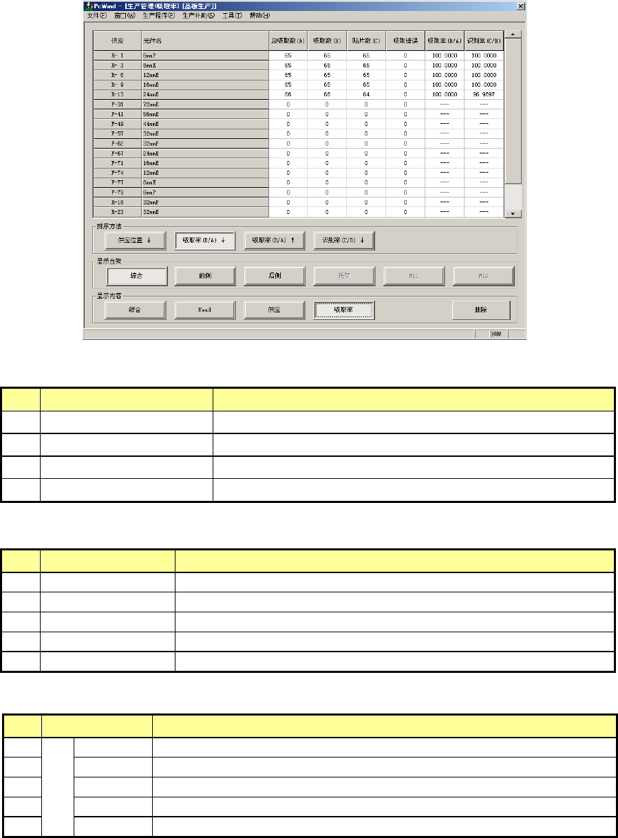 第 1 部 基本篇 第 2 章 生产 2-68 No. 项目 内容 1 供应位置 显示每个供应位置。 如果是 ETF8D 、管状供料器,则在括号内显示通道号。 2 元件名 显示元件名称。 3 总吸取数( A ) 吸取数 + 吸取错误数 4 吸取数( B ) 吸取成功的元件数。 5 贴片数( C ) 贴片成功的元件数。 6 吸取错误 吸取失败的次数。 7 吸取率( B/A ) 吸取成功的比例。 吸取率 = 吸取数 / (吸取数 + 吸取错…