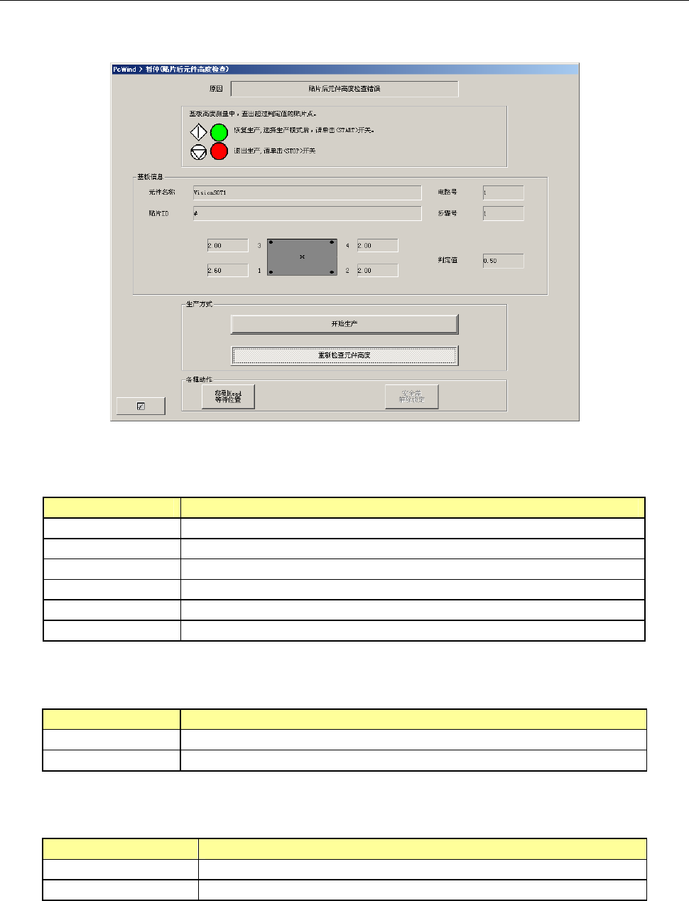 在贴片基板面高度错误画面里,按下<START>开关时,会按生产重新开始模式中指定的动作进行操