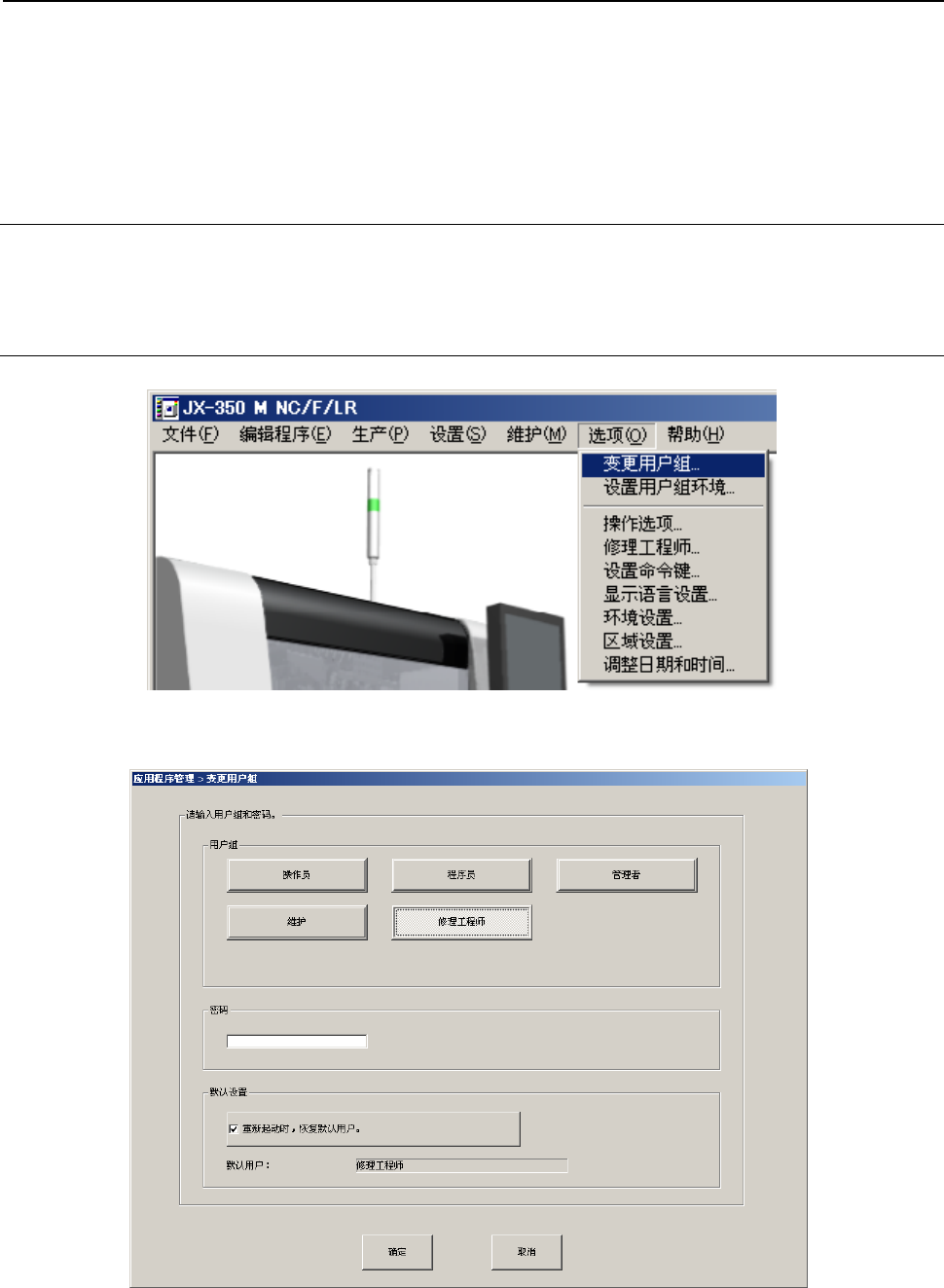 第 1 部 基本篇 第 4 章 制作生产程序 4-2 4-2 选项 菜单条的选项菜单,集中了各种功能,便于用户使用设备时的目的 · 状况进行设置。 在此对 「变更用户组」 、 「设置用户组环境」 、 「调整时间和日期」 、 「显示语言设置」 ( *1 ) 进行 说明。 另外,有关「操作选项」的说明,请参照『第 6 章 操作选项』。 4-2-1 用户组 本设备根据作业人员的操作熟练程度,设置了用户级别,对操作范围进行了限制。 变更用户组时…