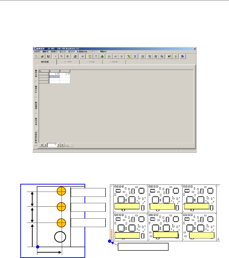 第 1 部 基本篇 第 4 章 制作生产程序 4-39 7mm 7mm 10mm 4-3-3-5 扩展坏板标记 在扩展坏板标记中,要输入从「基板基准位置」到各电路对应的「坏板标记」的位置。 请在识别时伴随的 Head 的移动距离缩短,或是不可能制作到电路内的标记时使用。 输入使用扩展坏板标记时的各电路的坏板标记坐标。 选择「基板数据」各画面左下的「扩展坏板标记」选项卡时,显示如下画面。 ◆ 矩阵电路板 从基准电路开始沿 X 方向间距 /…