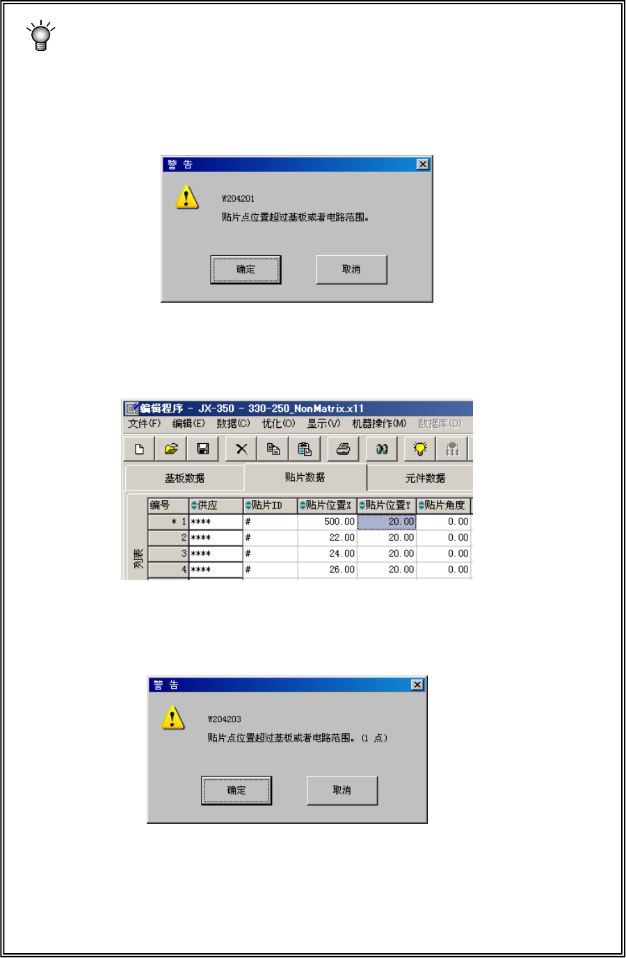 在输入贴片位置 X 或 Y 时,或分别进行了改变时,将进行范围检查。
