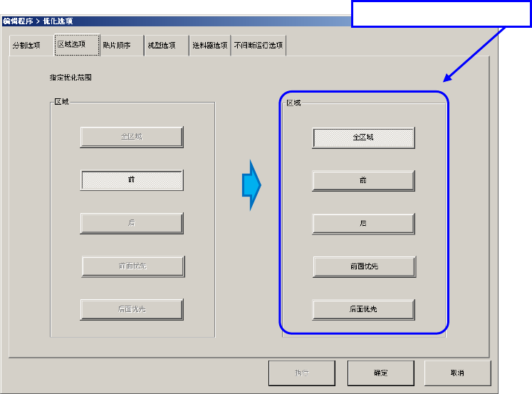 第 1 部 基本篇 第 4 章 制作生产程序 4-103 ( 2 )区域选项 指定配置供料器的区域。 根据“后侧供应装置”选项的有无,默认的选择状态及可选择的区域会不同。 <后侧供应装置选项> 有效 : 全区域~后面优先均可选择。(默认:全区域) 无效 : 仅可选择前侧。(默认:前侧) 1 )区域 a )全区域 :在整个区域的供料器台架上配置供料器。 通常的生产请选择此项。此种配置对优化无特定的条件限制,有利于保证节拍(速度…