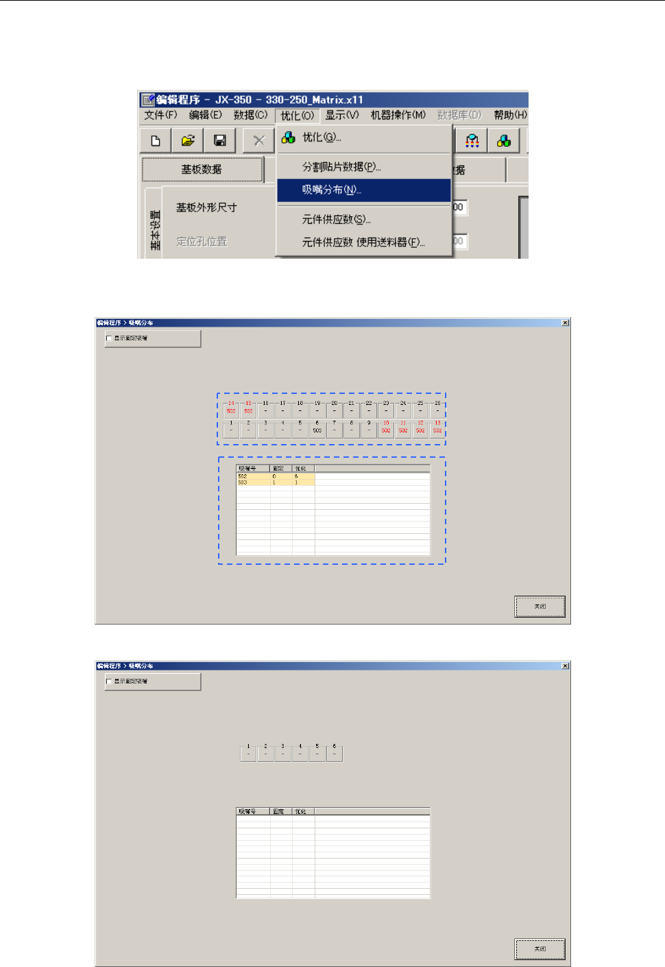 第 1 部 基本篇 第 4 章 制作生产程序 4-1 1 1 4-4-2-2 吸嘴分布 显示在各站点优化配置的吸嘴。 在优化条件中,将吸嘴配置指定为 “ 自动配置 ” 时,请在此确认配置结果 ,使吸嘴配置和机器设置 一致。 请从菜单中选择「优化」 / 「吸嘴分布」。 显示下图的吸嘴分布画面。 “螺丝式吸嘴”选项为有效时,会显示以下画面。