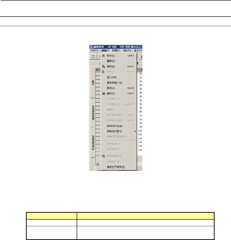 第 1 部 基本篇 第 4 章 制作生产程序 4-1 19 4-5 其他功能 4-5-1 编辑 4-5-1-1 编辑菜单 该功能是制作程序的辅助功能。 ※ 范围选择 要剪切或复制时,请先选择要删除或复制的范围,再进行操作。 范围选择以行为单位操作。 选择范围的方法 鼠标 拖拽鼠标,则被选择的行呈反色显示。 键盘 按住 [SHIFT] 键的同时,按下 [ ↓ ] 或 [ ↑ ] 键,则被选择的行呈 反色显示。