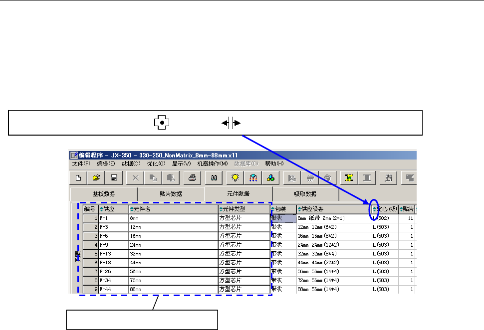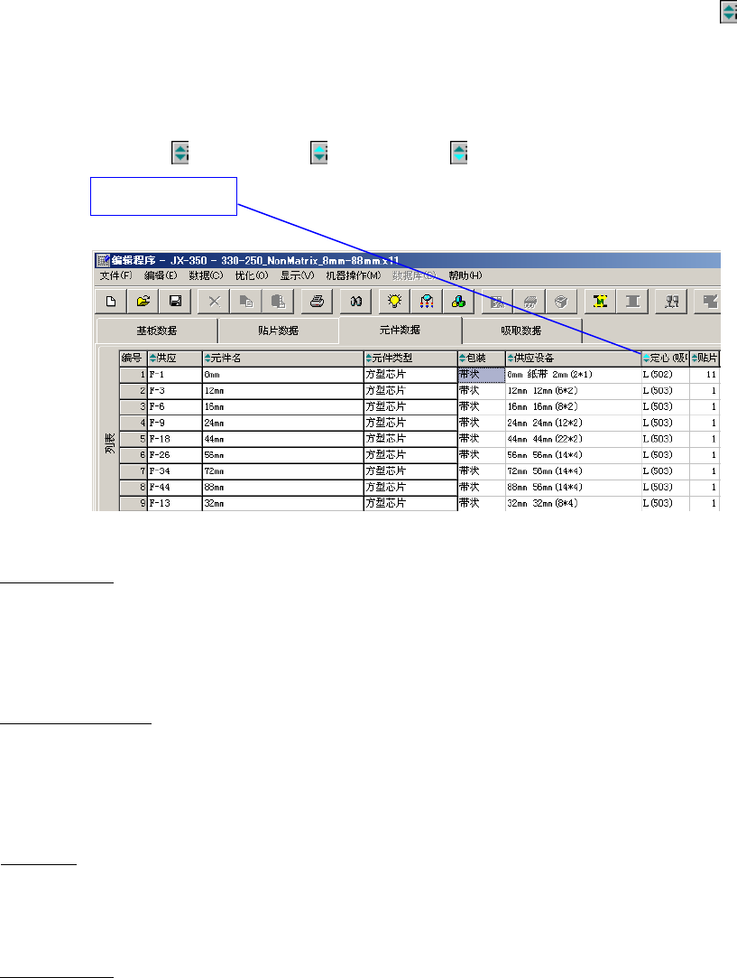 第 1 部 基本篇 第 4 章 制作生产程序 4-136 4-5-1-2 列表画面的功能 在编辑程序的各种列表画面上,可以调整单元格的宽度,使用数据排序功能。 ( 1 )调整列表画面上的单元格宽度 在贴片数据等列表画面上,可以调整单元格的宽度。 当光标呈十字型时, 把光标移到列的标题行 (显示项目名称区) 单元格边线附近。 当光标的左右 都变成箭头时,在保持该状态下拖拉光标,即可调整单元格的宽度。 但是, 在元件数据 列表画面上已标有元…