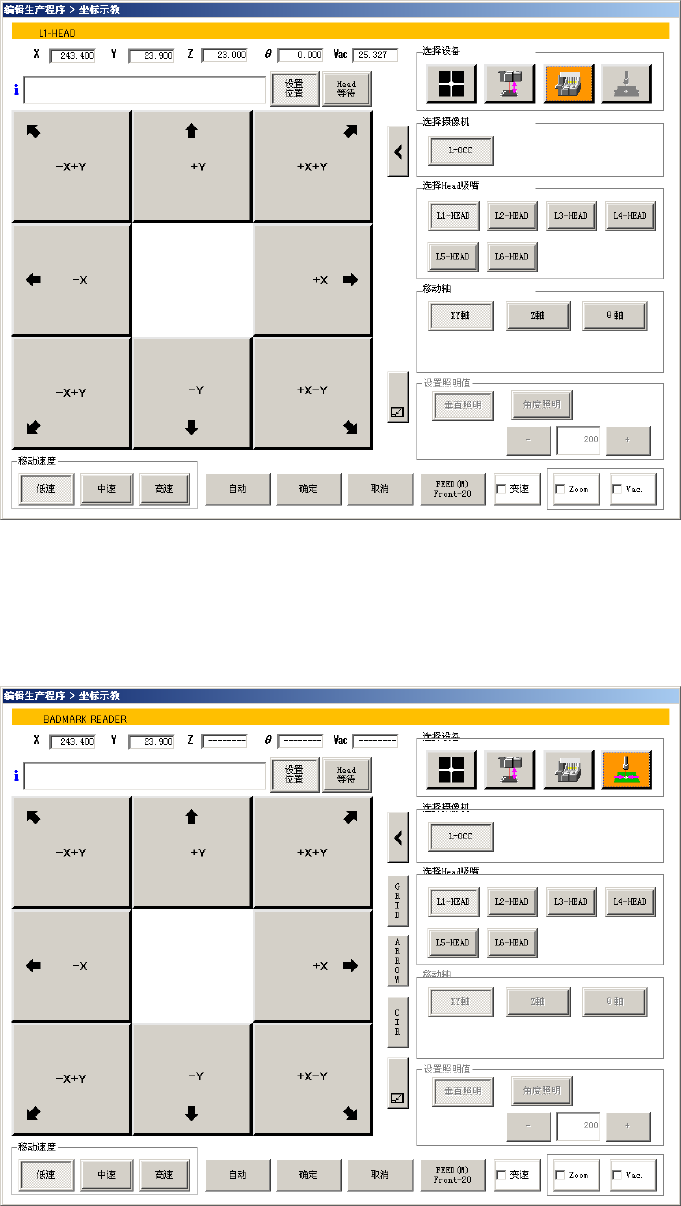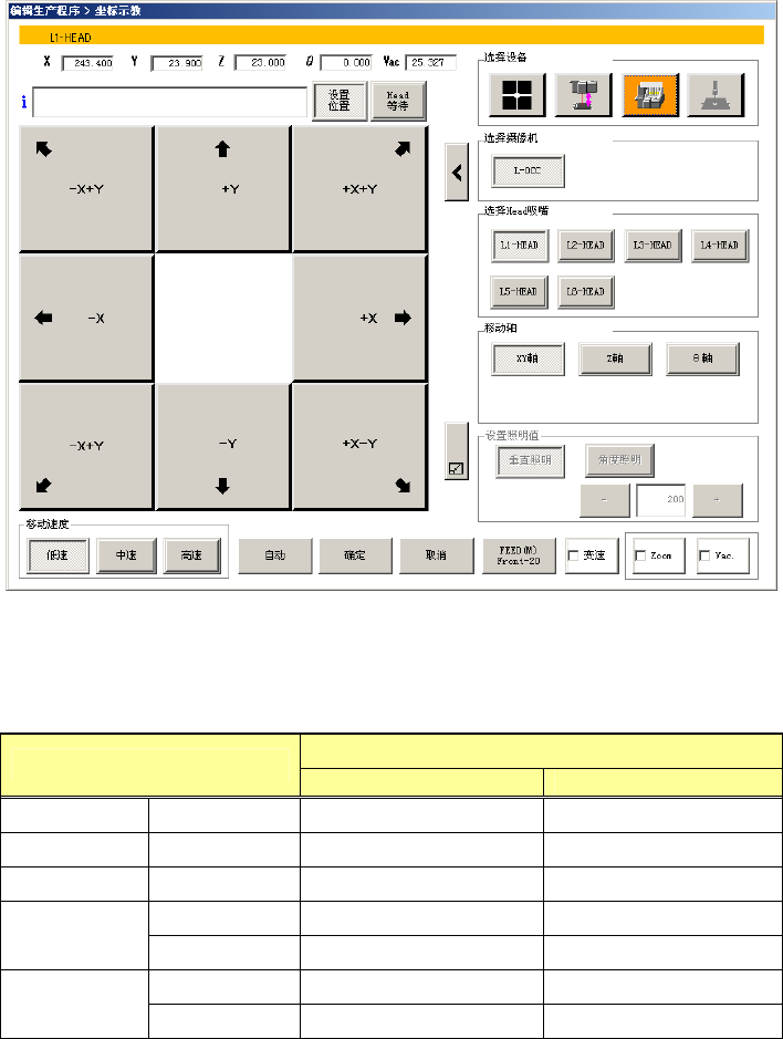 第 1 部 基本篇 第 4 章 制作生产程序 4-148 ( 2) 使用 Head 的各吸嘴进行示教的方法 在选择装置时,选择了 Head 装置、或选择 Head ( Head )吸嘴时选择各 HEAD 后, Head 会移 动到当前显示的坐标上。 1)XY 轴移动 选择移动轴的 [XY 轴 ] 按钮,用 8 个方向按钮使 XY 轴移动。 在 X 、 Y 各自的文本框里会显示出当前的 XY 坐标。 (3) 使用坏板标记进行示教的方法 在…