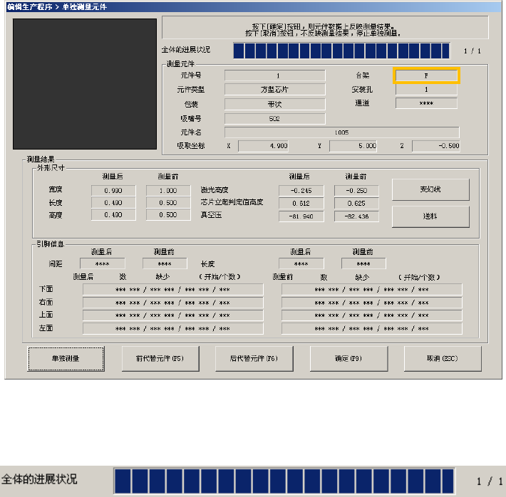 第 1 部 基本篇 第 4 章 制作生产程序 4-184 3) 单独测量结果 单独测量结束后,显示如下的结果画面。 a) 全体的进展状况 在进度条上显示当前的进展状况。 b) 测量元件 显示测量元件的内容及吸取位置。