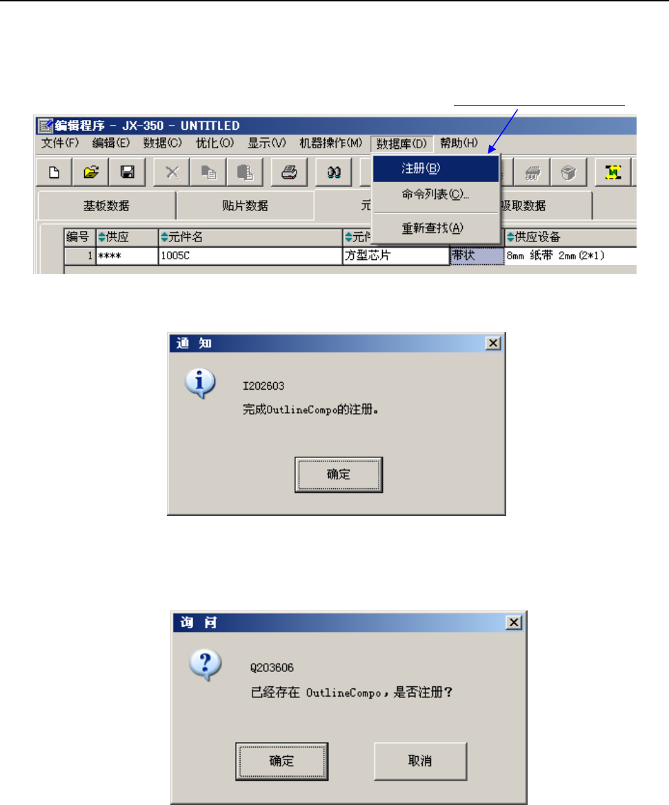第1部 基本篇 第5章 数据库 5-5 把环境设置的数据库注册完成通知设定为 「是」 的情况下, 数据库注册完成时, 会显示如下通知 。 把环境设置的数据库注册完成通知设定为 「否」 的情况下, 数据库注册完成时, 不显示上述通知 。 ● 对元件名逐一进行注册。 ● 注册目标数据库是指「环境设置 ( 参见 4-5-3 环境设置 ) 」所指定的数据库。