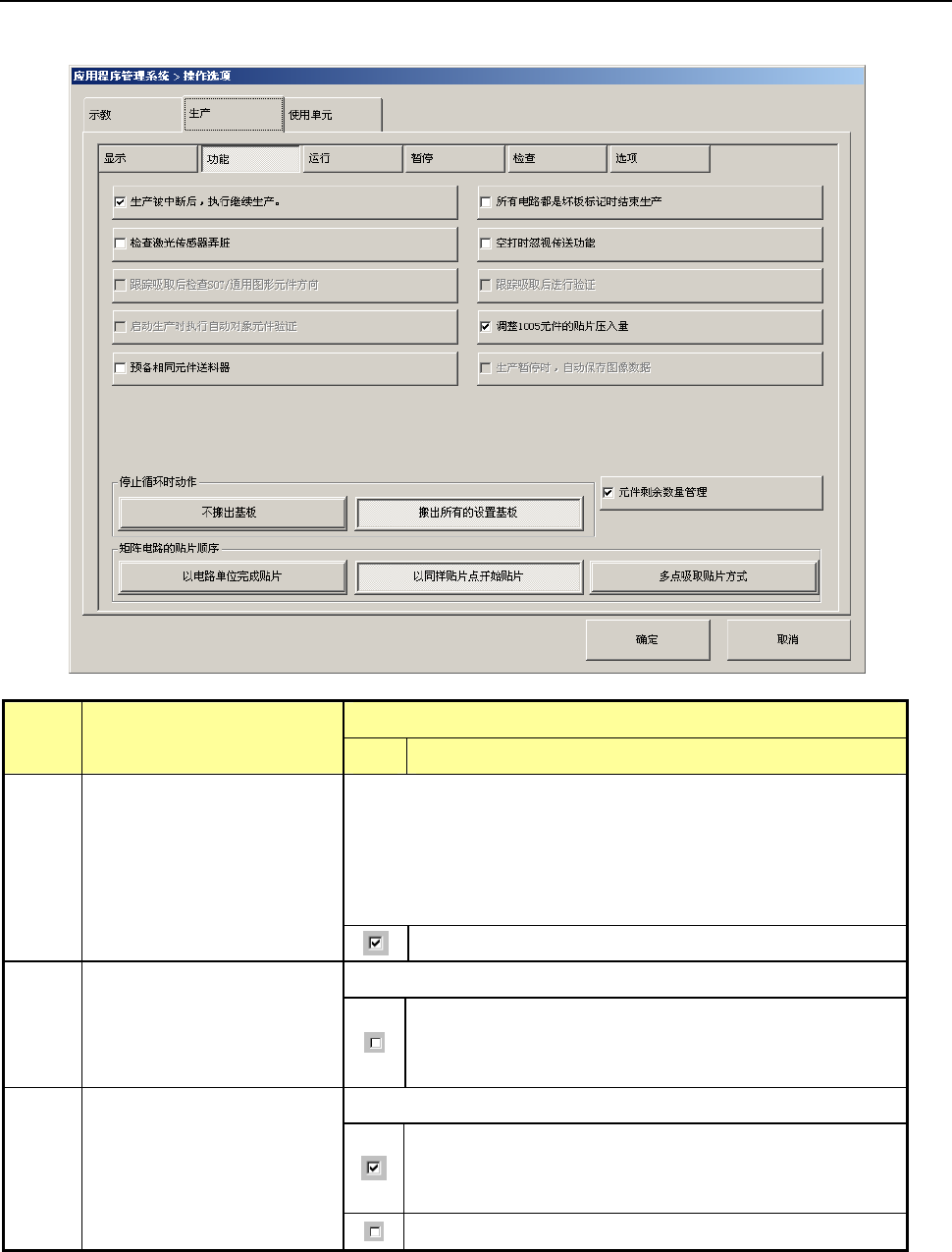 第2部 功能详解篇 第 6 章 操作选项 6-9 序号 项目 内容 状态 动作及详细内容 4 空打时忽视传送功能 对空打生产时是否进行传送动作进行设置。 空打时不进行传送动作。 空打时进行传送动作。 5 跟踪吸取后检查 SOT/ 通用 图像元件方向 设置吸取位置跟踪后是否要进行三端子 SOT 元件方向检查。 吸取位置跟踪后, 若是三端子 SOT 元件则进行方向检 查。 吸取位置跟踪后,不进行方向检查。 6 跟踪吸取后进行验证 不能选择。…